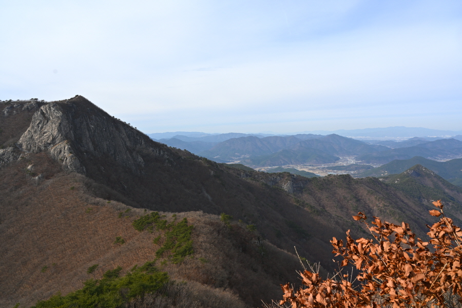 정상에서 보지 못한 조망을 여기서 즐기고 갑니다. 깨진바위 왼쪽은 수리봉 용암봉 승학산 정각산 실혜산 영산이, 오른쪽은 용당산 비룡산 호랑산 대왕산 통내산 학일산 장군봉 까치산 옹강산 지룡산과 멀리 비슬산 용각산 선의산 팔공산 등 밀양 청도 대구의 산이 펼쳐집니다. 발아래 대비지 대비사 왼쪽 봉긋한 봉우리는 개물방산입니다.