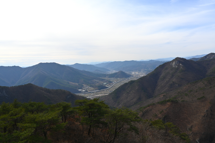 소나무 숲길을 3분쯤 오르면 바위 전망대가 나옵니다. 치마바위 상운암계곡 석골사와 운문산 서릉과 수리봉 사이에 멀리 용암봉이 보입니다.