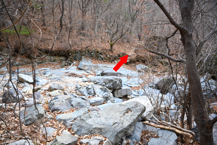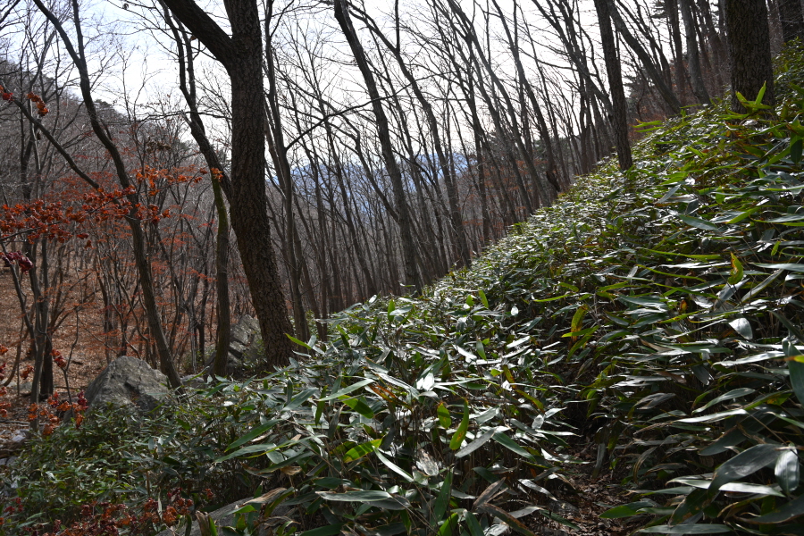 산비탈의 완만한 길은 왼쪽으로 꺾어 계곡에 내려섭니다. 물 마른 계곡을 건너갑니다 산죽 길을 지나 다시 건너옵니다.