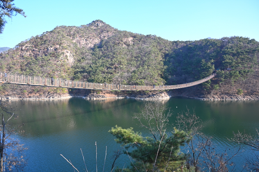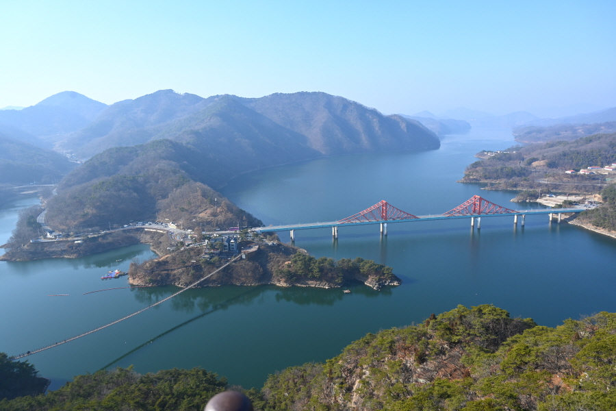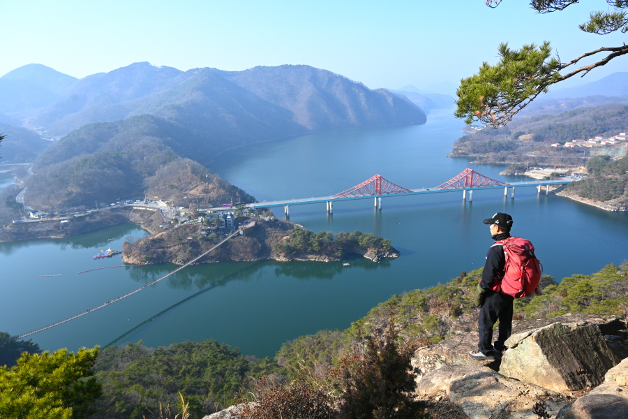서쪽으로 100m 떨어진 옥순봉 전망대를 갔다 옵니다. 충주호에 놓인 옥순봉 출렁다리와 호수를 가로지른 옥순대교 뒤로 거울 같은 물길이 끝없이 이어집니다.