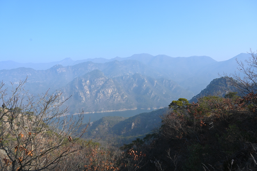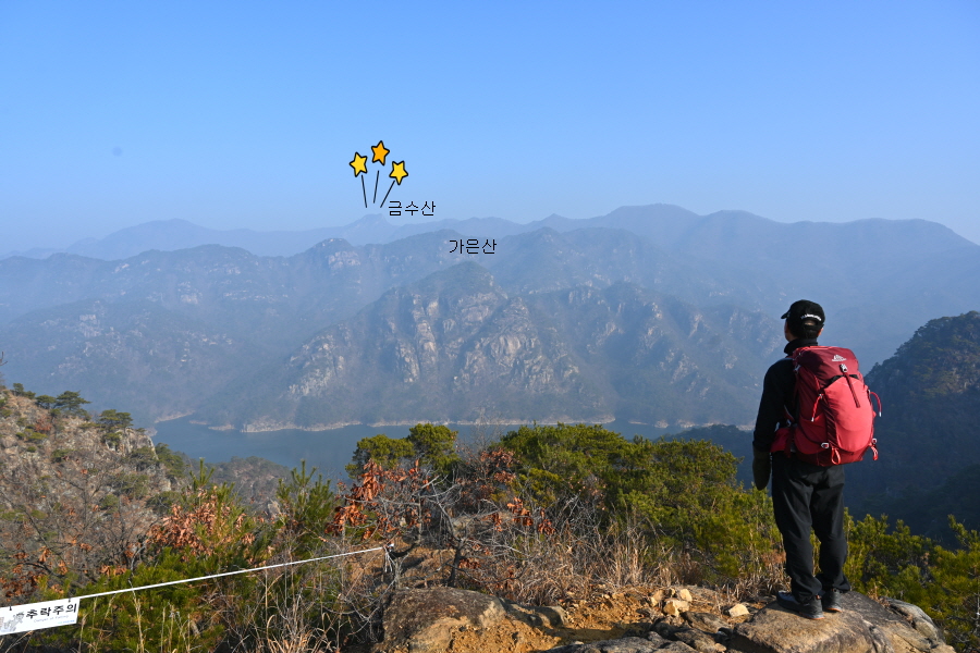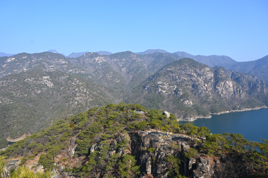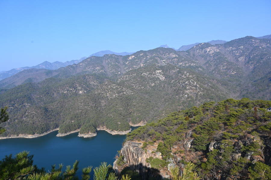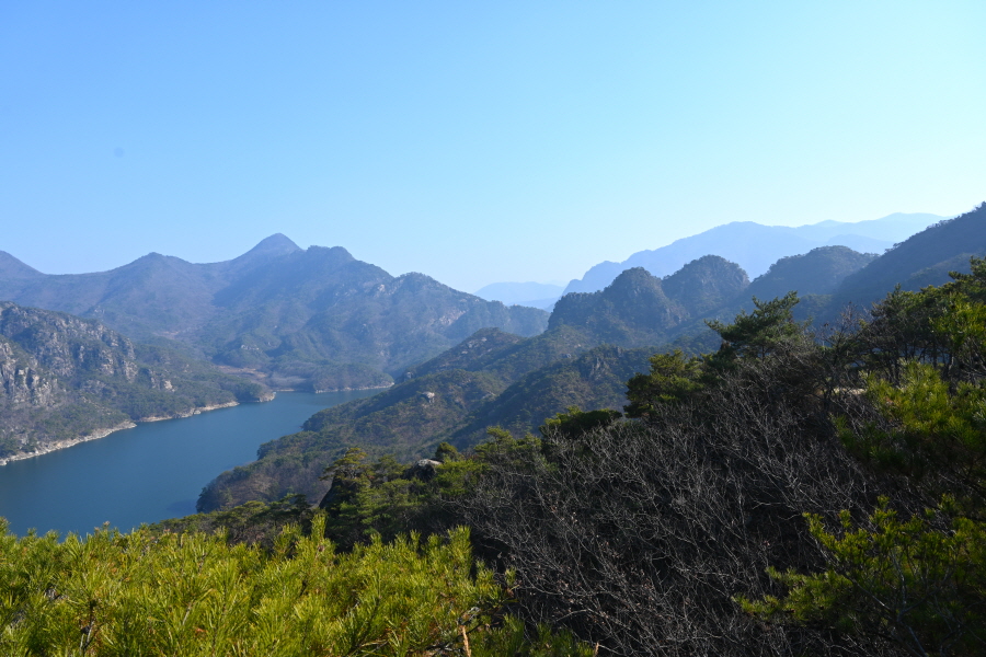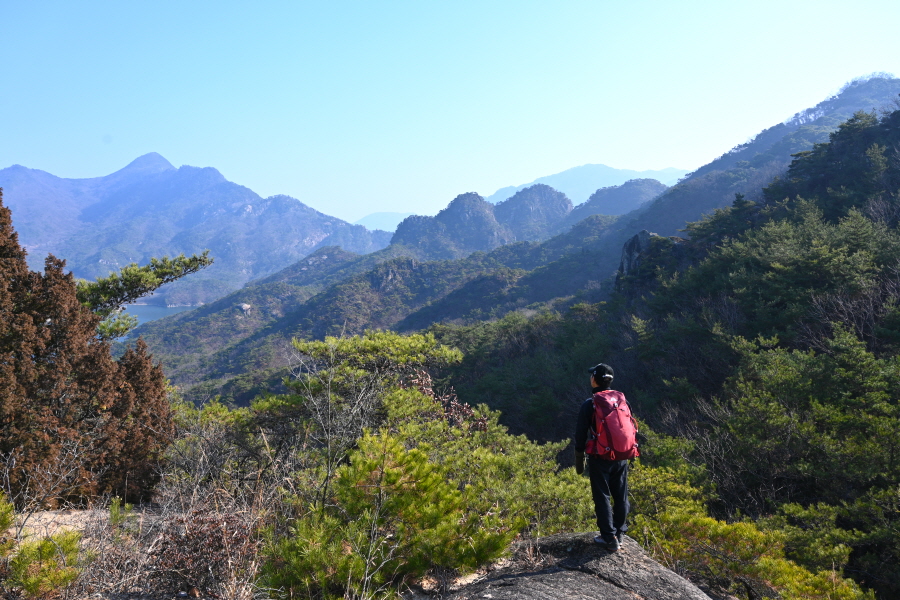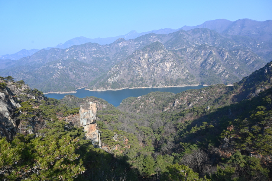 구담봉까지는 크게 두 번의 오르내림이 있지만 '빵빵' 터지는 전망대로 힘든 줄 모릅니다. 왼쪽으로 머리를 들면 툭 불거진 ‘어금니’ 같은 금수산이 우뚝하며 충주호는 울퉁불퉁한 바위 능선인 구담봉을 휘감았습니다.