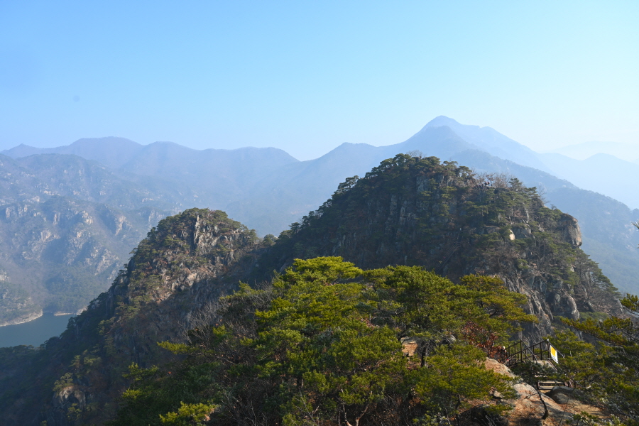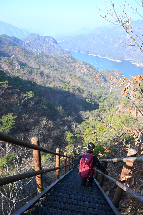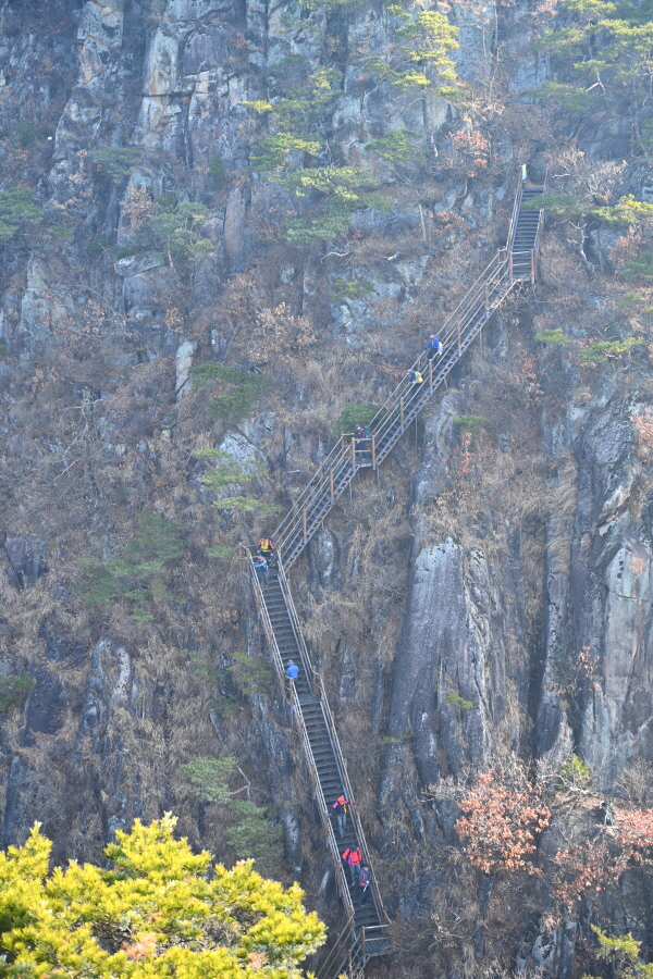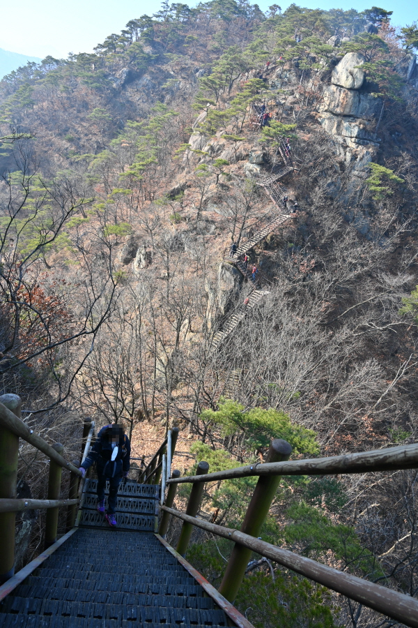 다시 ‘V자’ 안부에서 사다리를 받쳐놓은 듯 연속으로 경사진 철계단을 올라갑니다. 코가 닿을 만큼 가파른 철계단을 올라 한 숨 돌린 뒤 바윗길을 오릅니다.