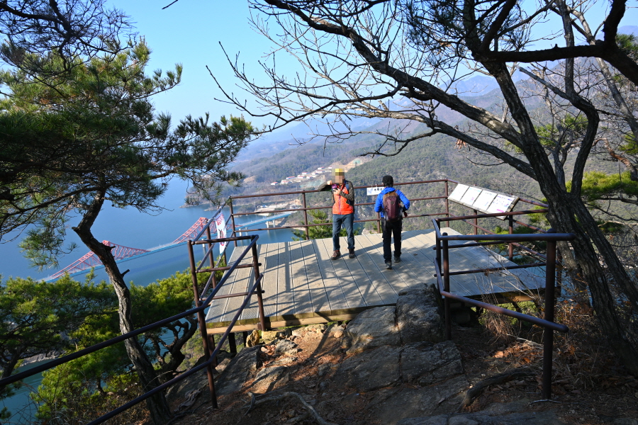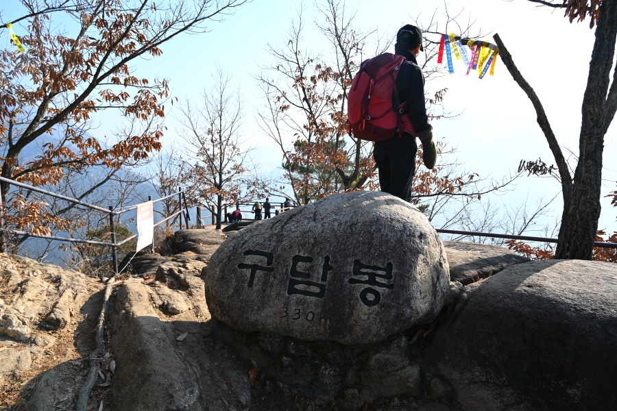 옥순봉·구담봉 삼거리에서 쉬엄쉬엄 주변 경관을 즐기며 약 40분이면 구담봉 정상석과 만납니다. 정상석 뒤쪽에 구담봉 덱 전망대가 나옵니다.