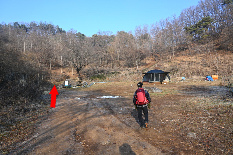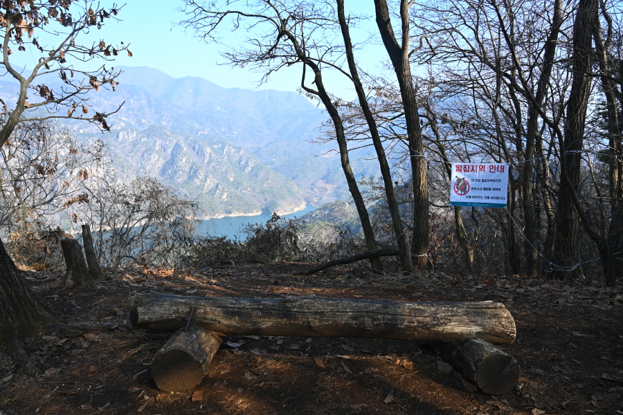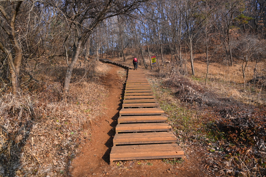 완만한 임도는 고개를 넘어 콘센트형 움막이 들어선 농장을 지납니다. 나무계단을 올라 고갯마루에서 옥순봉 구담봉은 오른쪽 능선을 탑니다. 야자매트가 깔린 완만한 길로 통나무 계단을 오릅니다.