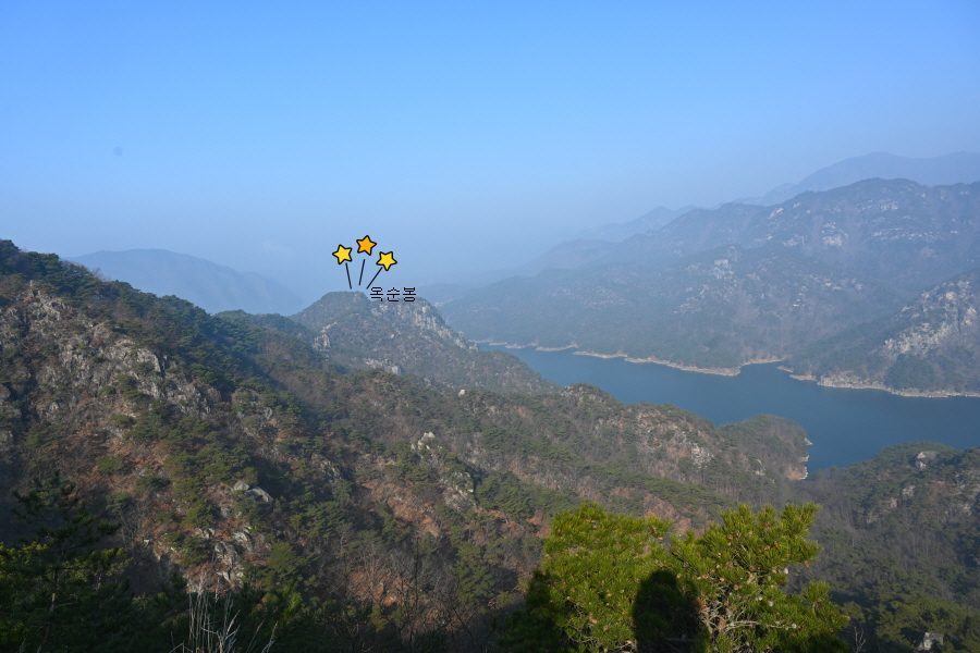 옥순봉(0.7㎞) 이정표를 지나 안부에서 다시 바윗길을 오르면서 조망이 열립니다. 왼쪽으로 봉황이 날개를 펼쳐 하늘로 비상하려는 듯 창끝같이 뾰쪽한 월악산이 보인다면, 오른쪽에는 옥순봉에 기댄 촛대바위가 볼거리입니다.