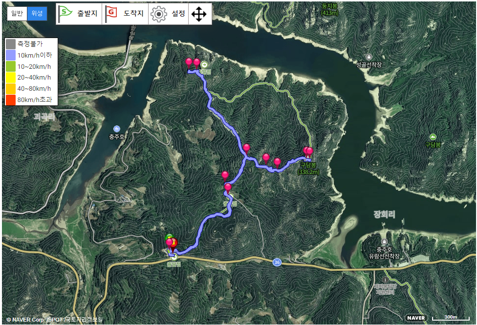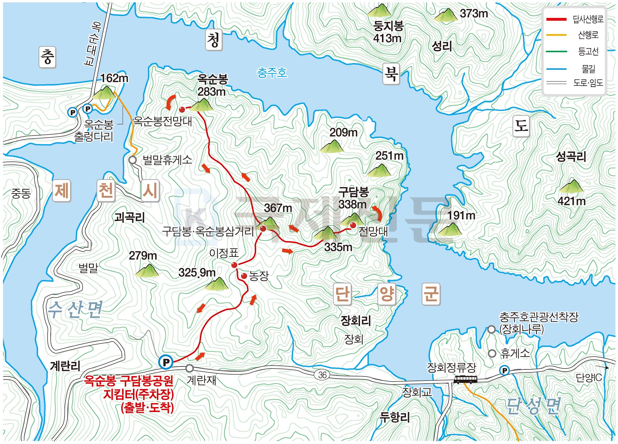 산행 경로를 보면 제천시 수산면 계란리 옥순봉 구담봉 공원 지킴터(옥순봉 구담봉 주차장)에서 출발~콘센터형 움막(농장)~구담봉·옥순봉 갈림길~구담봉 정상~구담봉·옥순봉 갈림길~옥순봉 정상~옥순봉 전망대~다시 구담봉·옥순봉 갈림길에서 옥순봉 구담봉 공원 지킴터로 되돌아 오는 원점회귀입니다. 산행거리는 약 5.8㎞이며, 3시간 30분 안팎이 걸립니다.