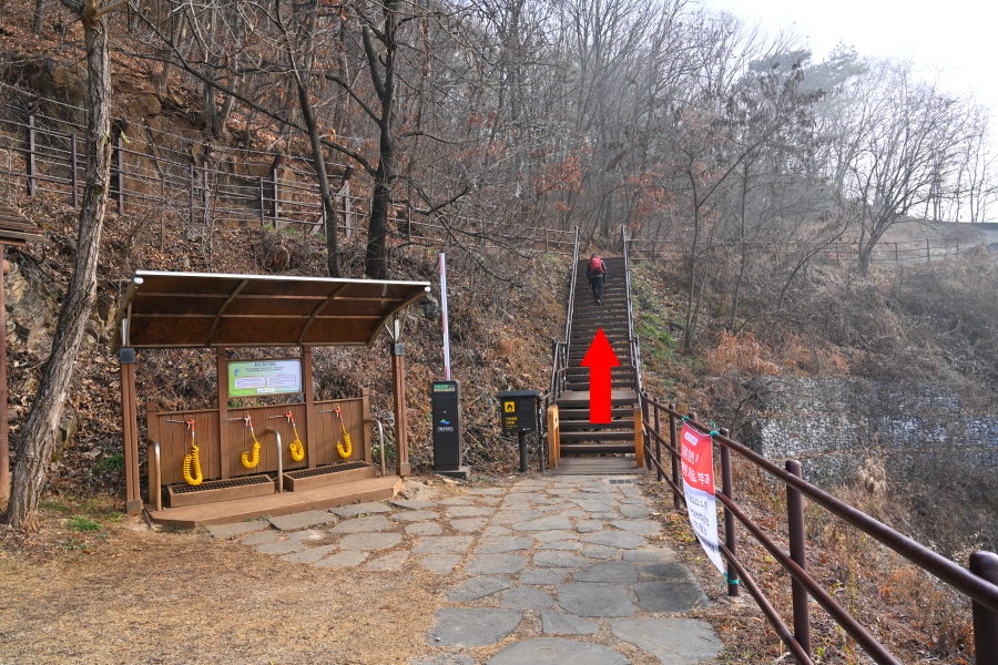 구담봉 철계단을 오르내릴 때 눈이 내렸다면 미끄러지지 않도록 조심합니다.