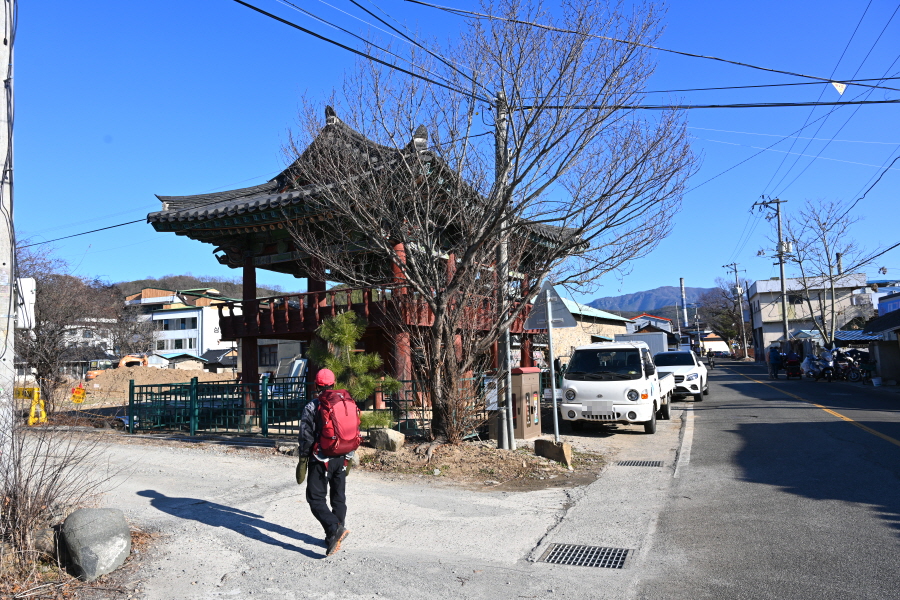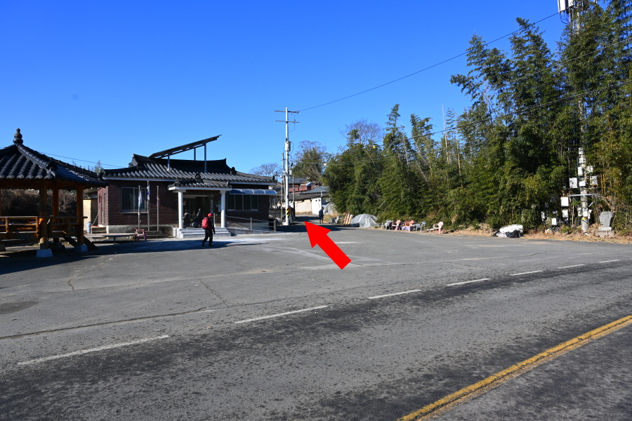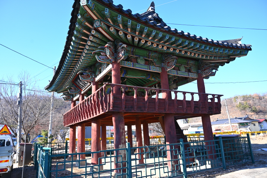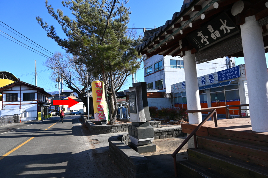 배수장 앞 삼거리에서 왼쪽 도로이며, 합천군에서 가장 오래된 누각 건물인 기양루를 지납니다.