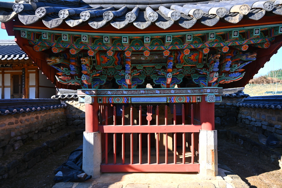 2분쯤이면 왼쪽 ‘번개들’로 불리는 ‘강궤평(降櫃坪)’에 기와집이 보입니다. 외토리 쌍비의 주인공인 이온을 향사하는 용연사와 용연서원입니다. 먼발치로 보며 그냥 지나갑니다.