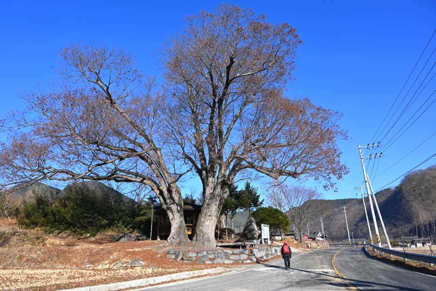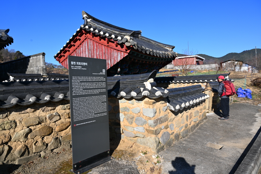 남명 조식 생가지는 큰 느티나무가 보이는 방향으로 도로를 직진합니다. 삼거리에서 오른쪽 보호수로 지정된 느티나무를 지나면 ‘외토리 쌍비’가 나옵니다. 비각 안에는 고려 말 낙향한 이온의 효행을 기리는 효자비와 비바람에 글씨가 지워진 ‘백비’가 있습니다.