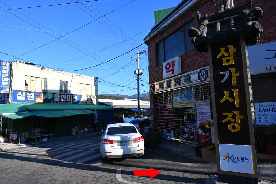 삼가 우체국과 삼가시장 앞 갈림길에서 오른쪽입니다.