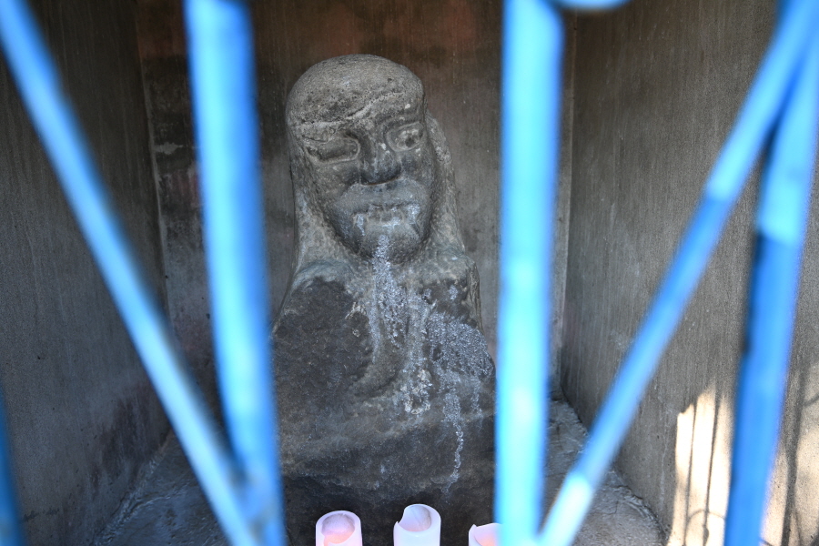 직진해 '삼가 방향'의 원금마을 입구에 ‘할배미륵불’을 모신 당집이 있습니다. 마을로 들어가는 나쁜 기운을 막는 역할로 세워졌던 것으로 보이며, 도로 건너에 마주보며 할매미륵불이 있습니다.