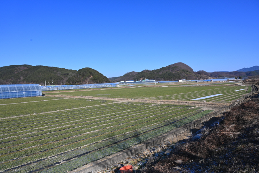 이쪽은 모두 마늘 밭입니다. 사각 쉼터를 지나면 오른쪽 멀리 삼가면의 동쪽을 두른 산성산 한우산 자굴산이 펼쳐집니다.