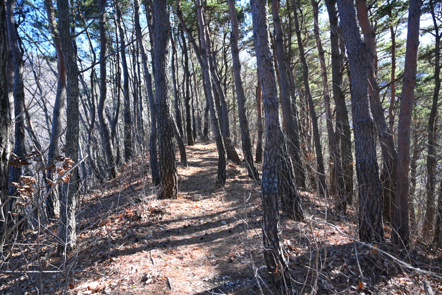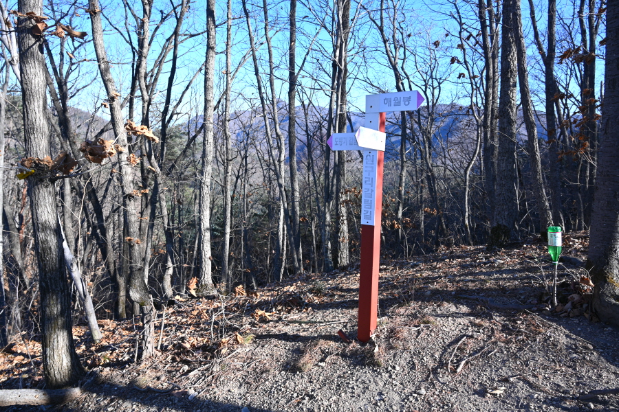 완만한 능선은 폐 임도를 가로질러 소나무 숲을 내려가면 이정표와 안내도가 나옵니다.