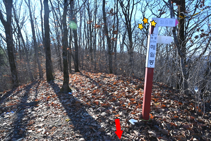 눈은 볼 수 없고 그 대신 무릎까지 빠지는 낙엽 러셀을 합니다. 10분쯤이면 이정표가 서 있는 능선 갈림길에 올라섭니다. 이정표 기둥에 해월봉 정상이라 표시해놓았습니다. 정상에서 동해를 보면 바다에 뜬 고깃배가 밝힌 등불이 달 같이 보인다고 해서 해월봉이 유래했다고 하나 잡목으로 조망은 없습니다.