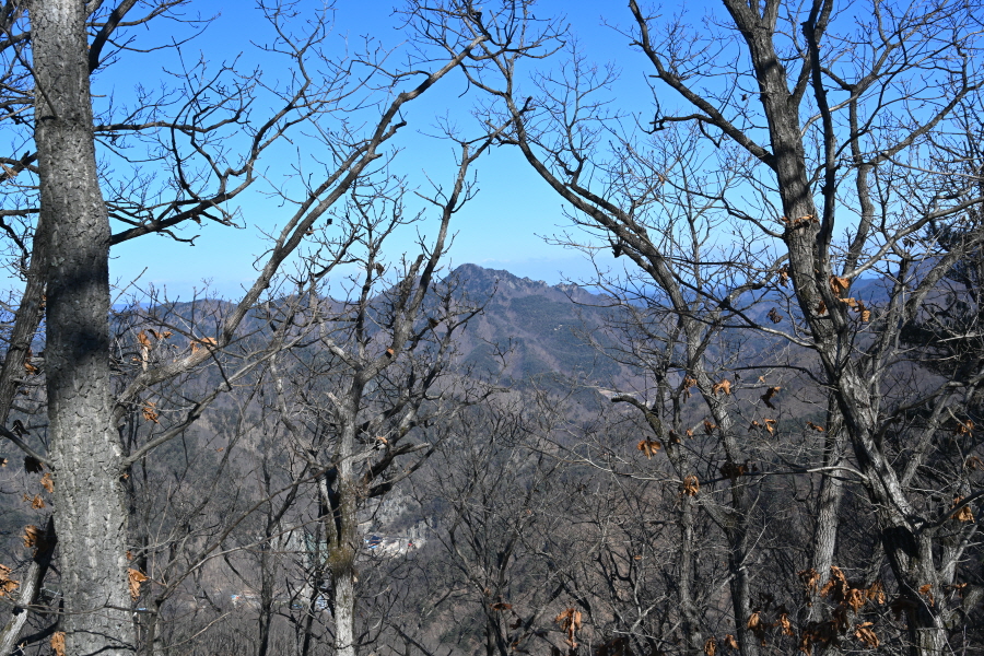 북쪽 무장산 뒤로 두리뭉실한 주왕산 국립공원이, 오른쪽으로 여덟 암봉인 팔각산과 바데산 동대산이 나뭇가지 사이로 보일 뿐 조망이 시원하게 터지는 전망대 한 곳 찾을 수 없었습니다.