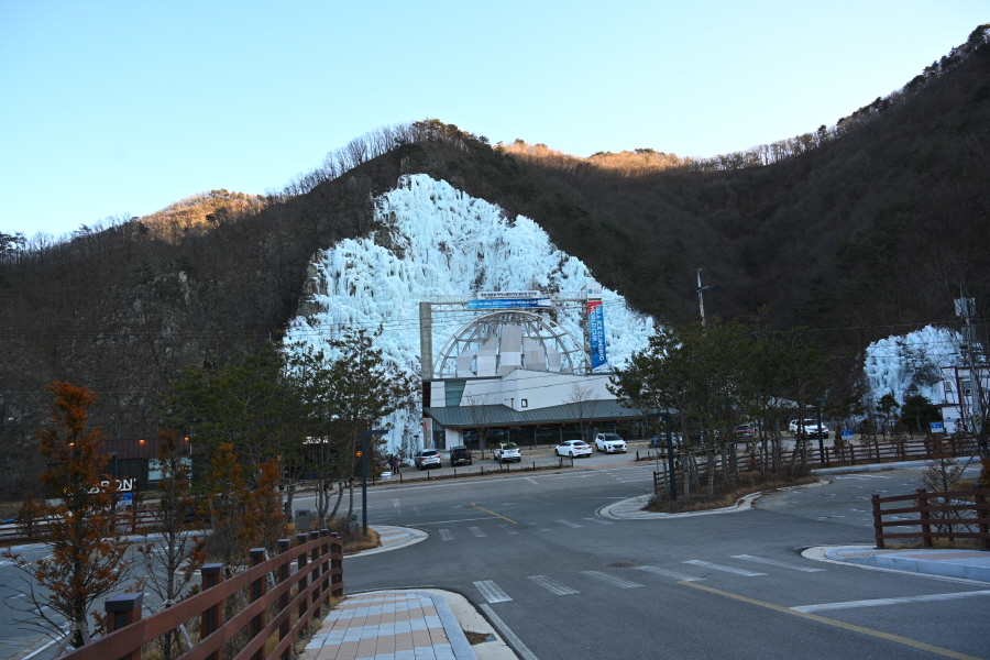 얼어붙은 폭포의 넓이가 100m에 달할 만큼 국내 최대 규모입니다. 두 빙폭은 계곡물을 끌어올려 만들었습니다. 여름에는 거대한 물줄기가 떨어지는 인공폭포지만 겨울에는 얼어붙어 또 다른 볼거리를 선물합니다.