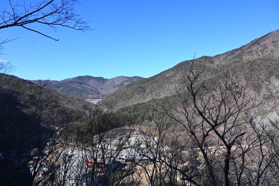 입구에서 25분이면 바위전망대에 도착합니다. 발아래 얼음골 약수터 주차장과 원자바위 인공 빙폭 뒤로 구불구불한 계곡 왼쪽에 울퉁불퉁한 봉우리는 팔각산이며, 오른쪽 봉긋한 봉우리는 바데산입니다.