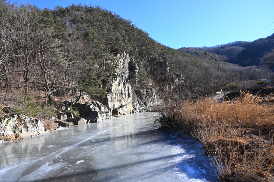능선 갈림길에서 약 25분이면 원구리 마을 앞 얼어붙은 계곡에 놓인 징검다리를 건너 도로에 올라서고, 얼음골 주차장은 왼쪽으로 길손식당을 지나 20분이면 도착합니다.