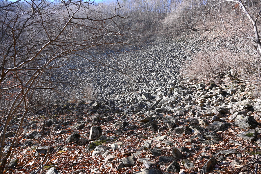 해월봉(1.5㎞)은 왼쪽 계곡에 놓인 징검다리를 건너면서 시작합니다. 항리·진흥사(4.5㎞) 이정표에서 돌계단을 오르면 바위 틈새에 얼음이 언다는 잣밭골 너덜겅이 정면에 펼쳐집니다.