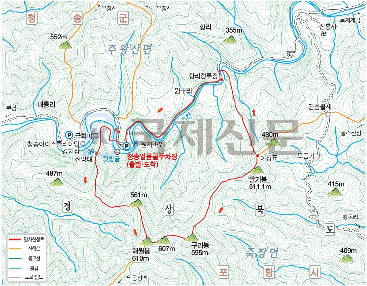 산행 경로는 청송 얼음골 약수터 주차장~얼음골 약수터~해월봉 입구~561m 돌탑봉~해월봉 정상~구리봉 정상~달기봉~원구리·도등기 갈림길 삼거리~원구리마을(항리)~얼음골 약수터 주차장으로 되돌아오는 원점회귀입니다. 산행거리는 약 5.5㎞이며, 3시간 안팎 걸리는 무난한 코스입니다.