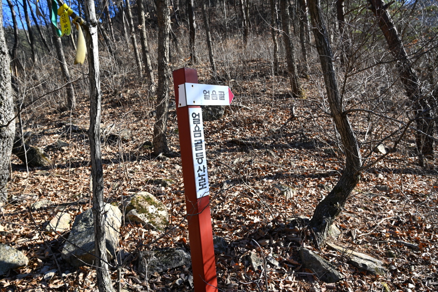 삼각점이 있는 달기봉(511.1m)을 왼쪽으로 돌아 20분이면 이정표가 선 갈림길에 도착합니다. 왼쪽 원구리(1.5㎞) 방향으로 내려갑니다. 산행리본이 많이 달린 오른쪽은 ‘도등기 갈림길’ 방향이며 항리 진흥사, 영덕 팔각산 주차장으로 가는 종줏길입니다.