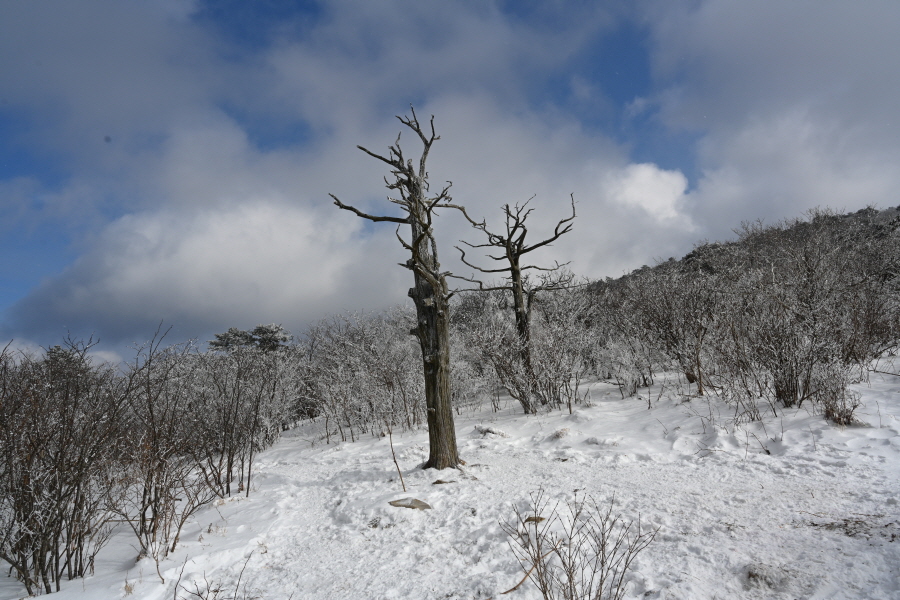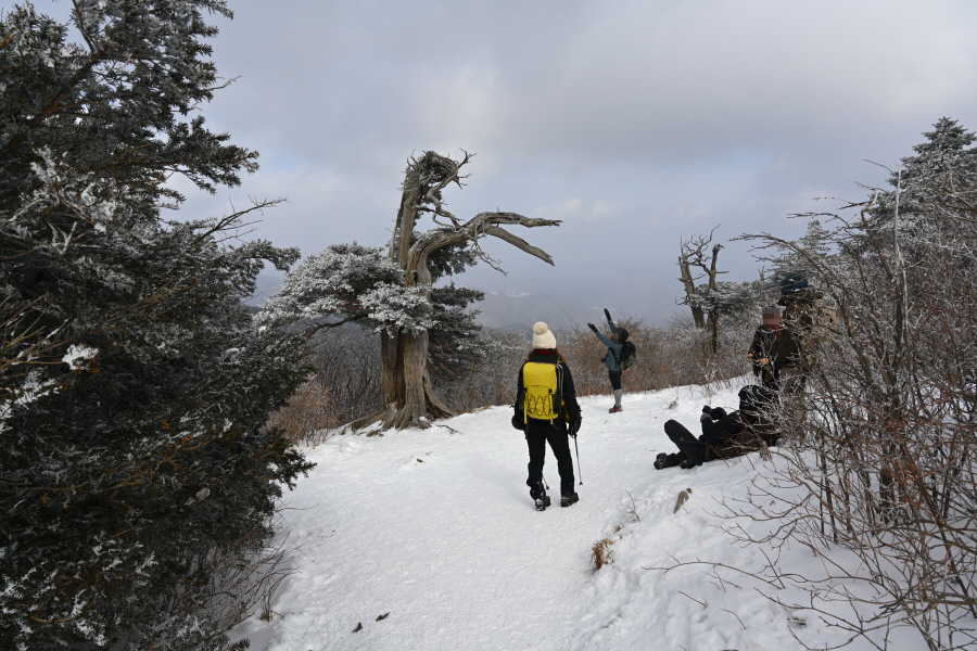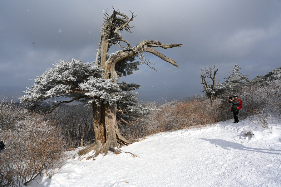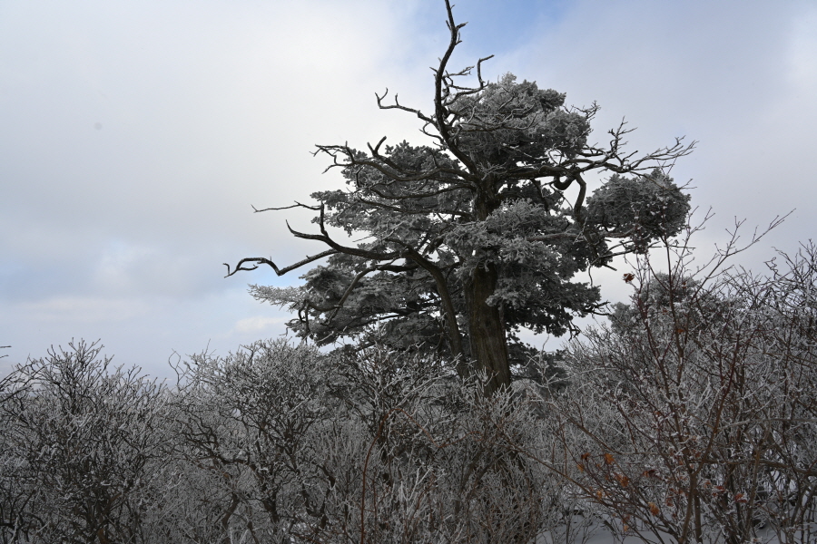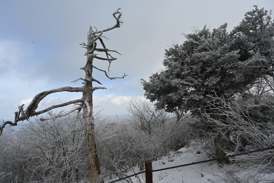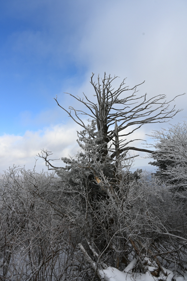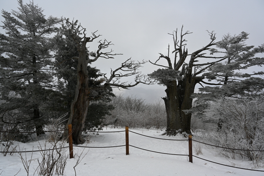 날씨는 흐려 조망은 멀리까지 열리지 않는 대신, 태백산의 상징인 주목이 모습을 드러냈습니다. ‘살아 천년 죽어 천년’ 한다는 주목이 도깨비 뿔을 닮았습니다. 허리춤에는 얼음 꽃이 핀 초록 잎을 둘렀지만 속은 곪아 텅텅 비었습니다. 머리 꼭대기는 벗겨져 속살을 드러내며 추위와 바람에 맞서고 있습니다.