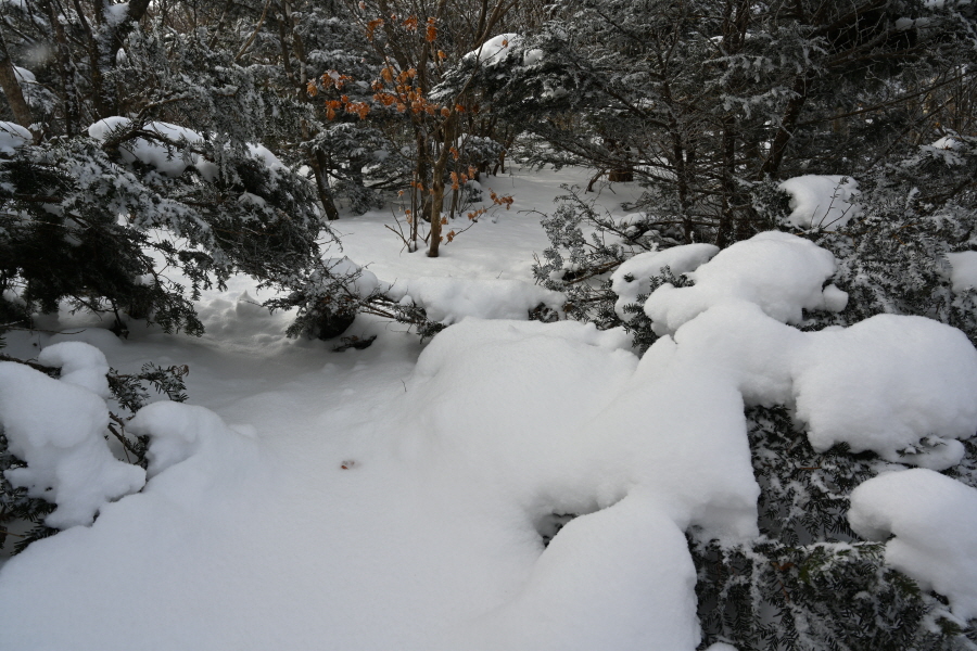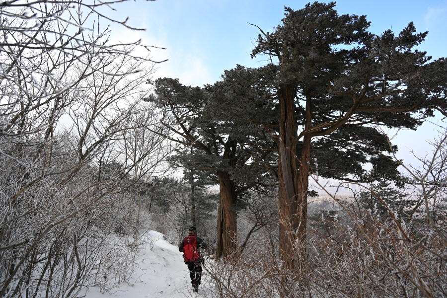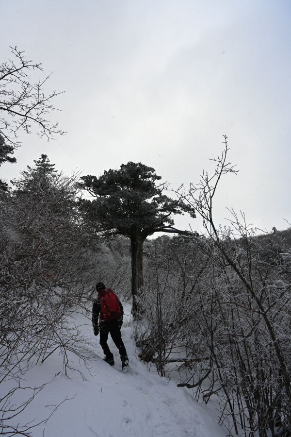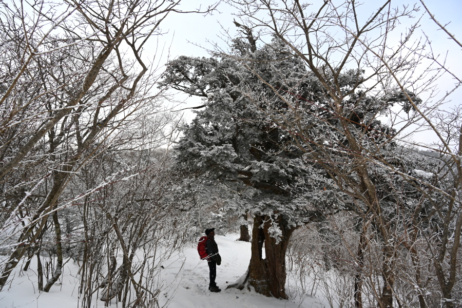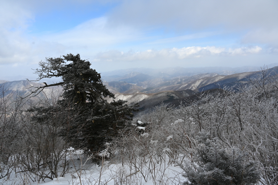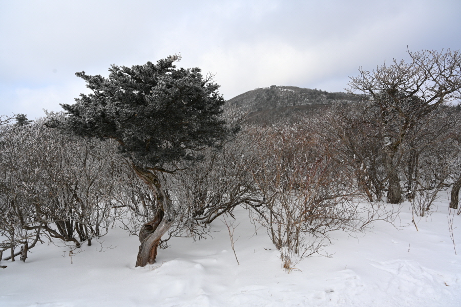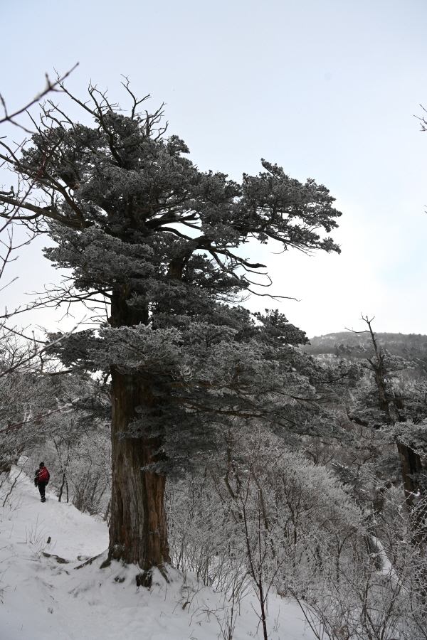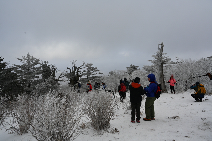 날씨는 흐려 조망은 멀리까지 열리지 않는 대신, 태백산의 상징인 주목이 모습을 드러냈습니다. ‘살아 천년 죽어 천년’ 한다는 주목이 도깨비 뿔을 닮았습니다. 허리춤에는 얼음 꽃이 핀 초록 잎을 둘렀지만 속은 곪아 텅텅 비었습니다. 머리 꼭대기는 벗겨져 속살을 드러내며 추위와 바람에 맞서고 있습니다.