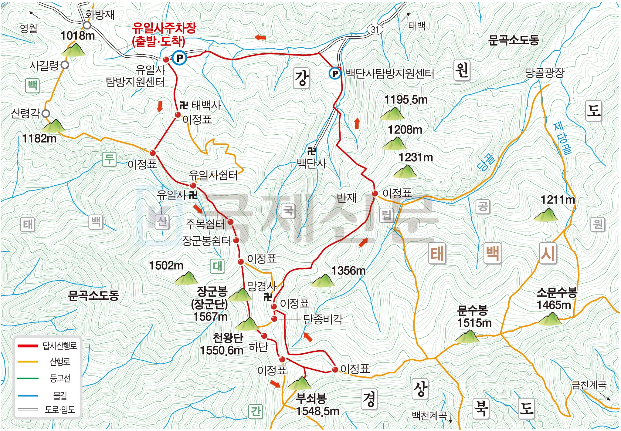 산행경로를 보면 유일사주차장~유일사탐방지원센터~태백사~천제단·유일사·사길령 갈림길~백두대간 능선 삼거리~유일사 쉼터~장군봉 안전 쉼터~천제단·망경대 갈림길~장군봉(장군단)정상~영봉(천왕단)~천제단 하단~문수봉·백두대간 갈림길~부쇠봉 정상~망경대·문수봉 갈림길~천제단·반재 갈림길~단종 비각~망경사~반재 쉼터 갈림길~백단사 갈림길~백단사 탐방지원센터를 지나 31번 국도를 따라 유일사 입구 주차장으로 되돌아오는 원점회귀입니다. 산행거리는 약 11㎞이며, 5시간 안팎이 걸립니다.