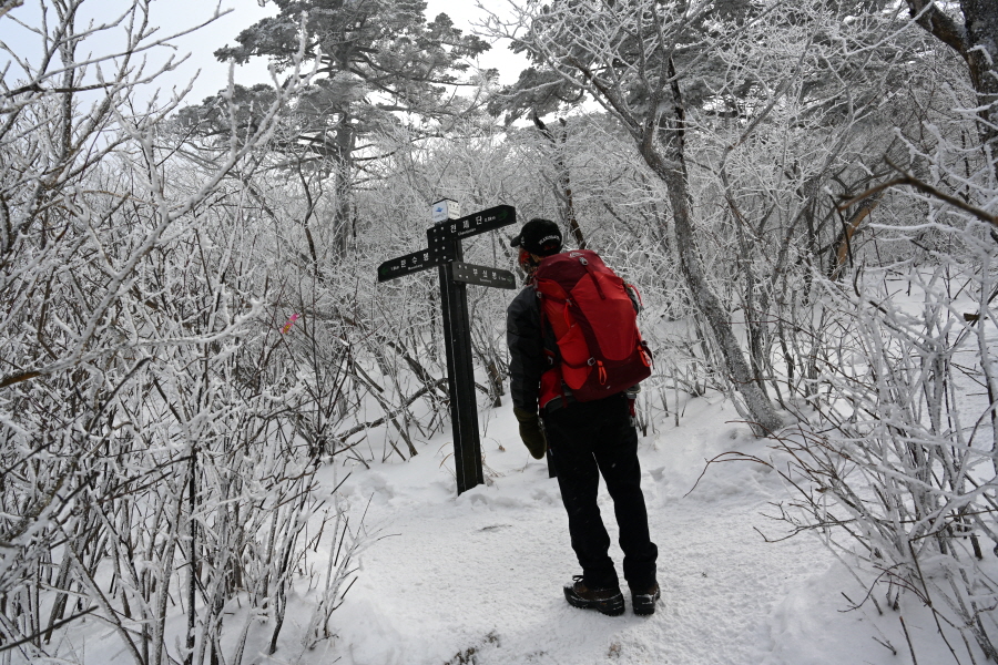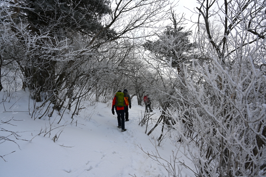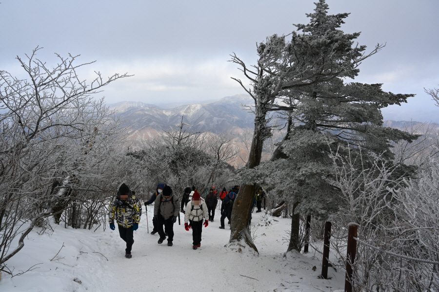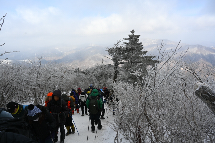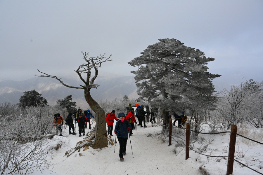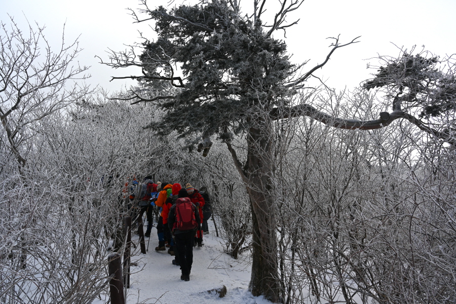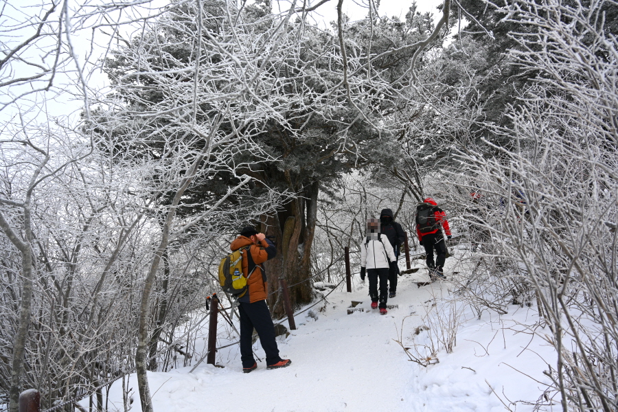 산길은 다시 줄을 서며 등산객의 흐름에 발을 맞추어 올라갑니다. 천제단(1.4㎞) 이정표를 지나자 가지마다 ‘얼음 꽃’인 상고대가 폈습니다.