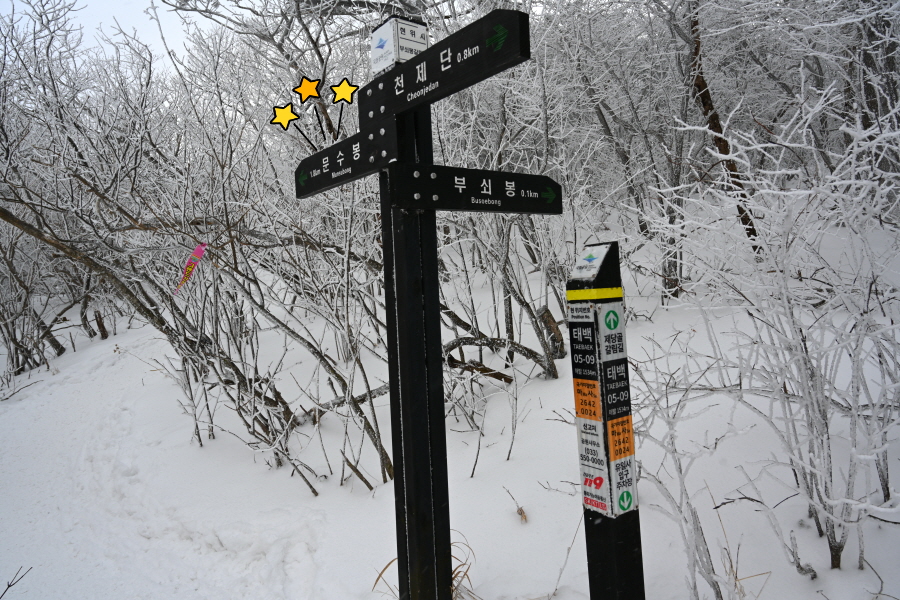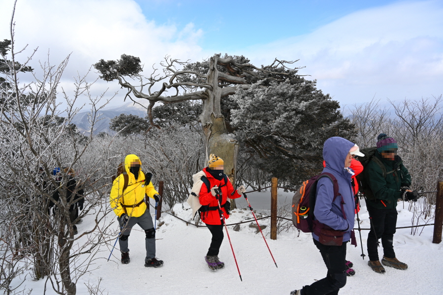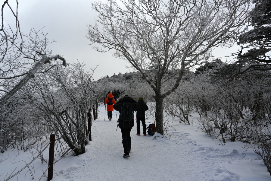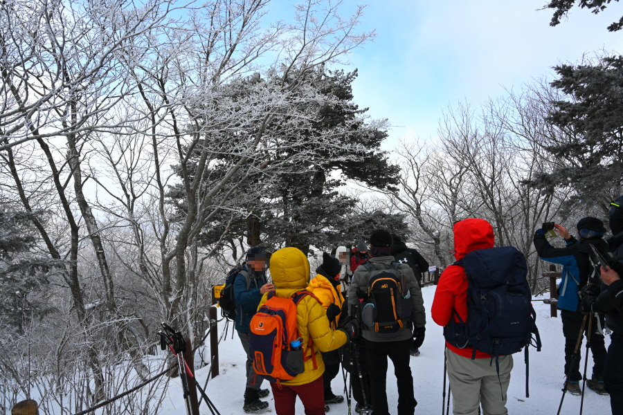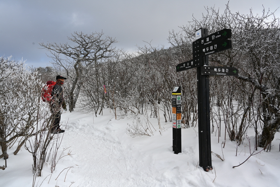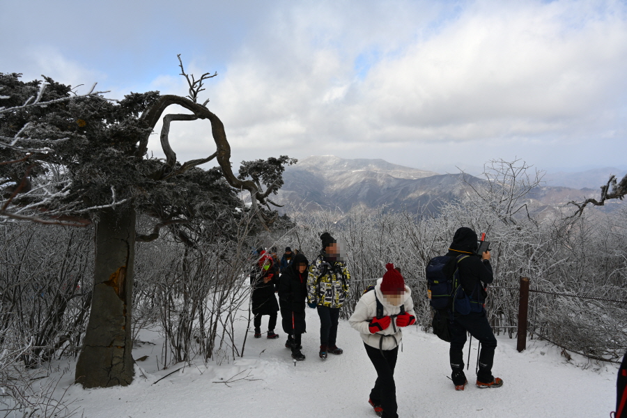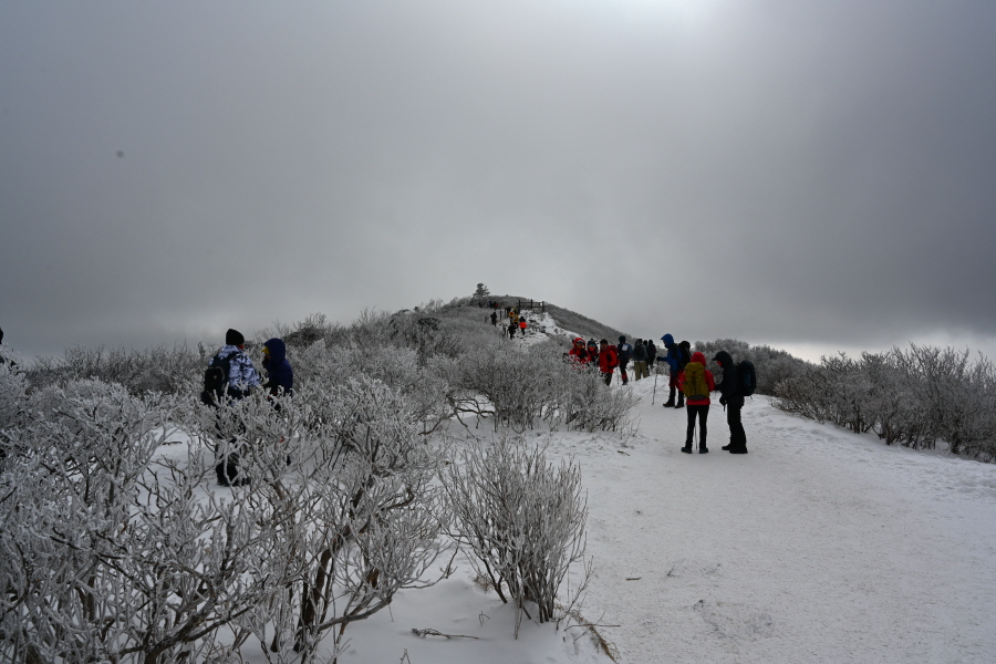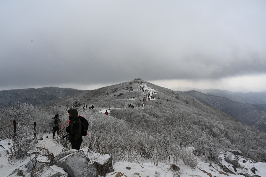 산길은 다시 줄을 서며 등산객의 흐름에 발을 맞추어 올라갑니다. 천제단(1.4㎞) 이정표를 지나자 가지마다 ‘얼음 꽃’인 상고대가 폈습니다.