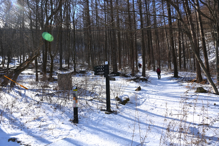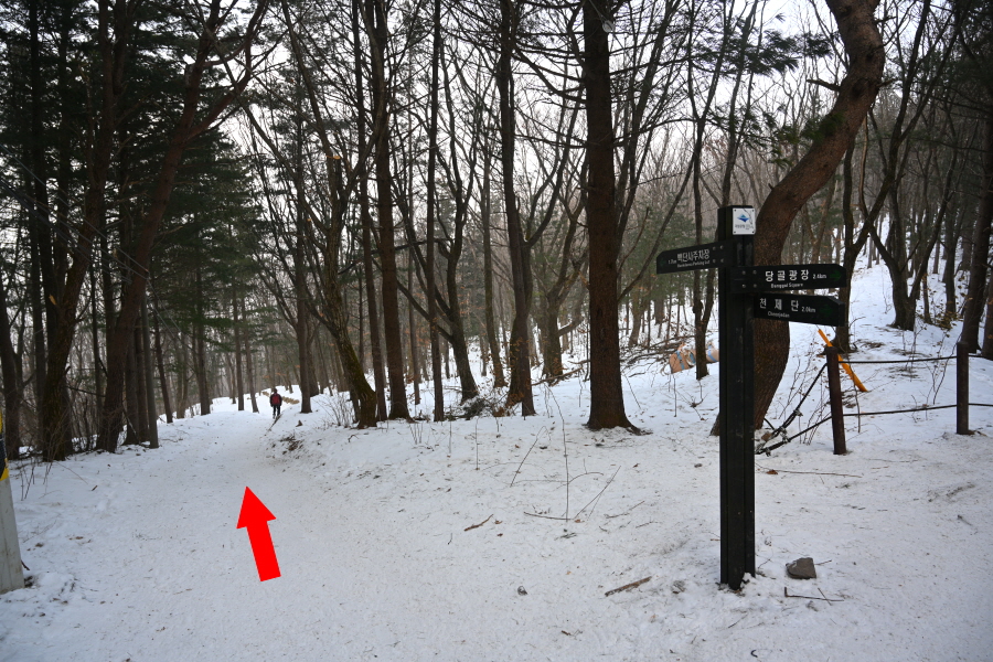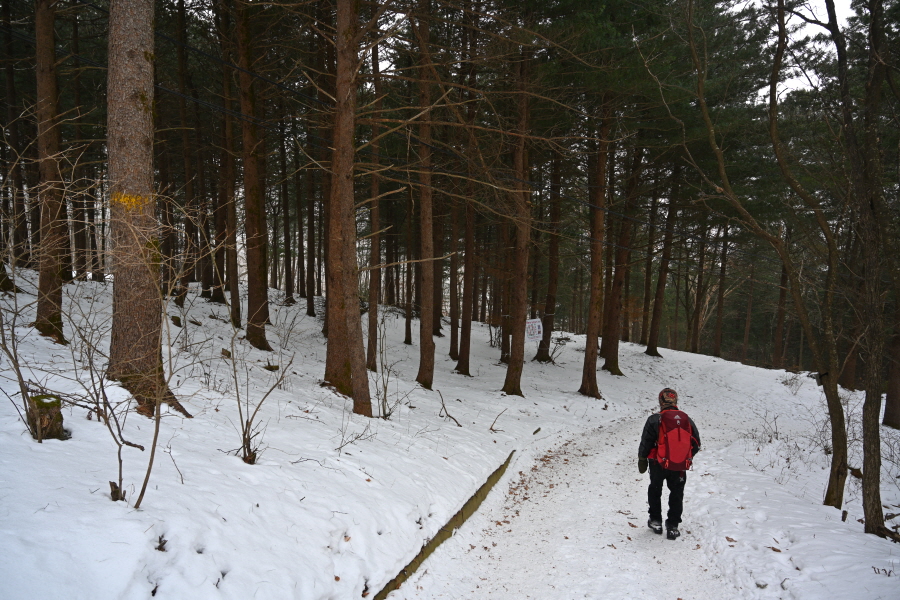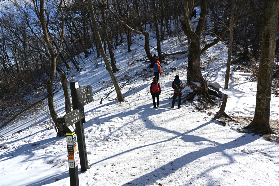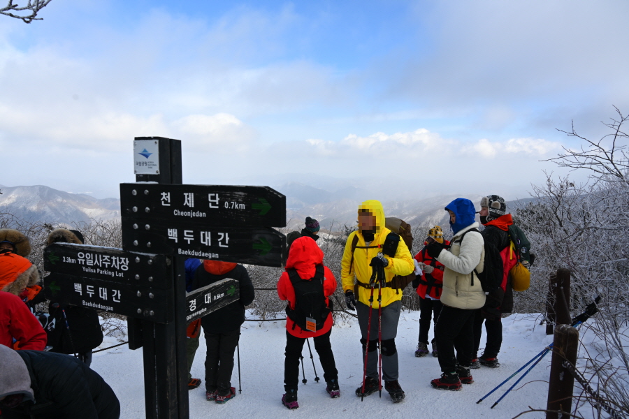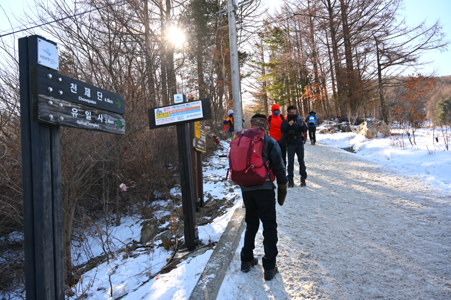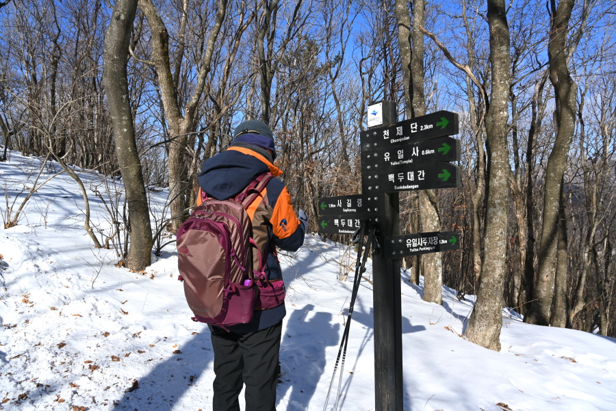 큰 이깔나무의 배웅을 받으며 너른 길을 따라 약 20분이면 태백사를 지납니다. 차단기를 통과하면 이내 이정표 갈림길이 나옵니다. 산행 당일 수많은 등산객이 한꺼번에 유일사 탐방로에 몰렸습니다.
