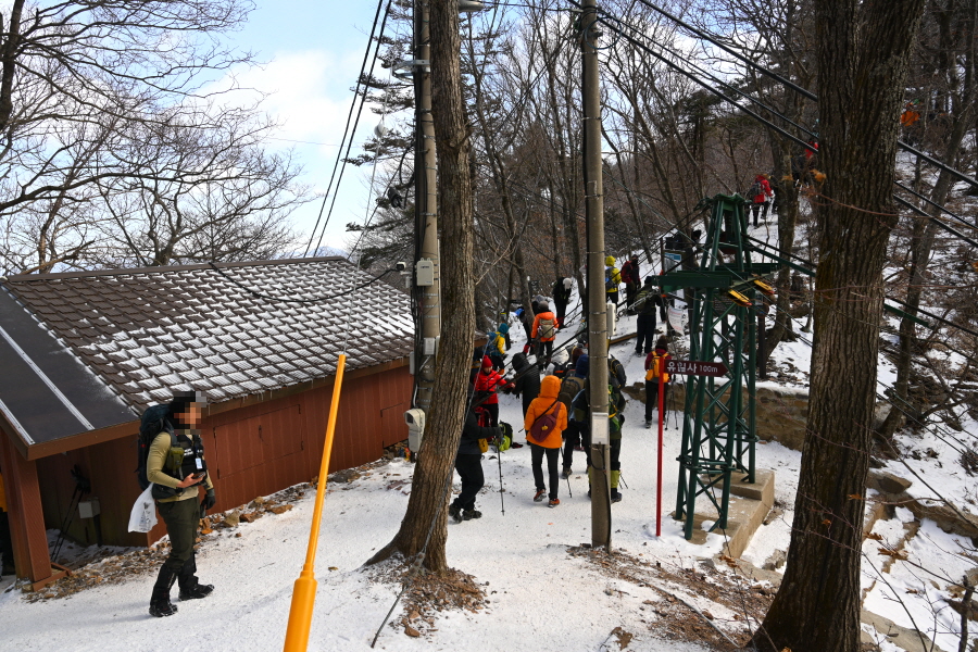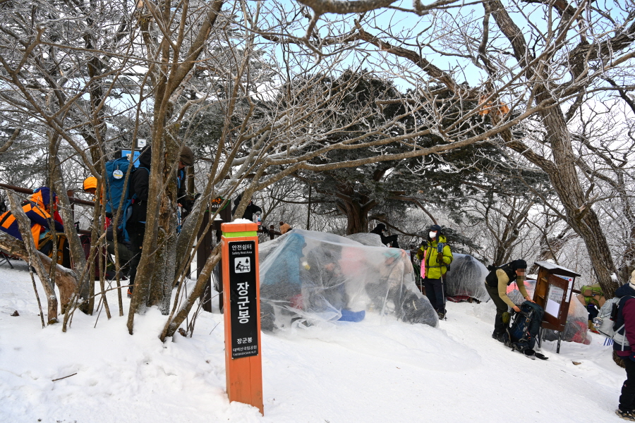 어느 듯 구급함이 설치된 장군봉 안전 쉼터, 거치대에 베낭을 걸고 잠시 앉아 쉴 수 있습니다. 그러나 바람이 거세 쉴 엄두를 내지 못했습니다. 한쪽에는 점심 먹을 동안만이라도 추위를 피하려고 삼삼오오 모여 큰 비닐을 뒤집어쓰고 있습니다.