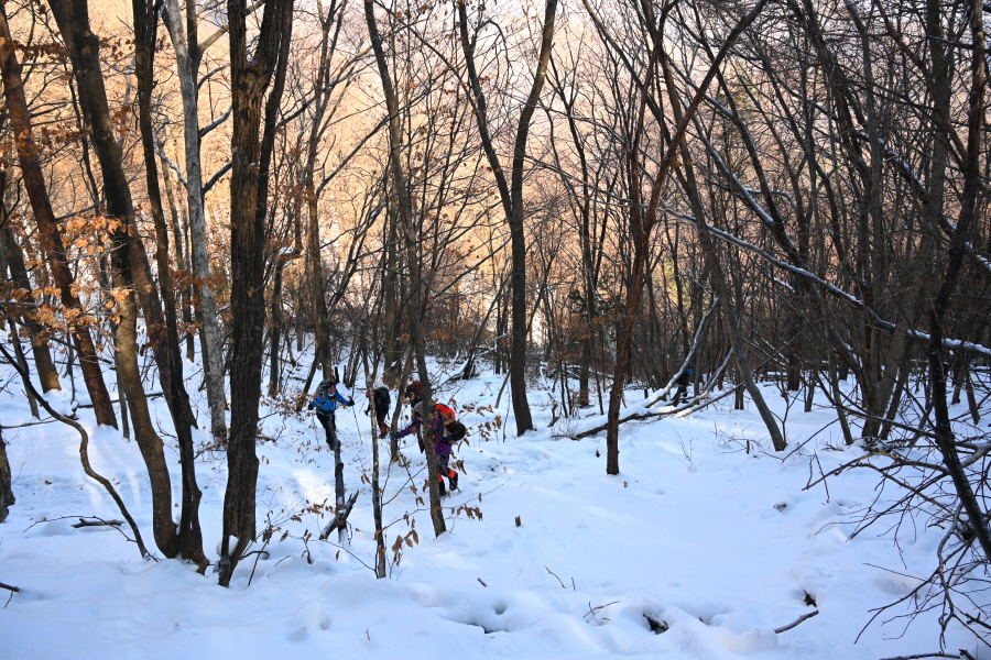 서쪽으로 태백산 특유의 매서운 칼바람이 불어 눈만 나오는 모자와 바람막이 덧옷으로 중무장 합니다.