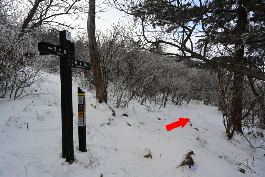 5분이면 나오는 ‘태백 05-10’ 표지목 갈림길에서 왼쪽 망경대(1.1㎞)로 꺾습니다. 오른쪽은 문수봉으로 갑니다.