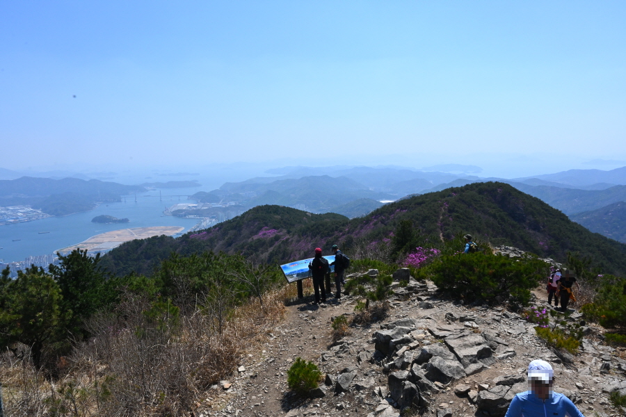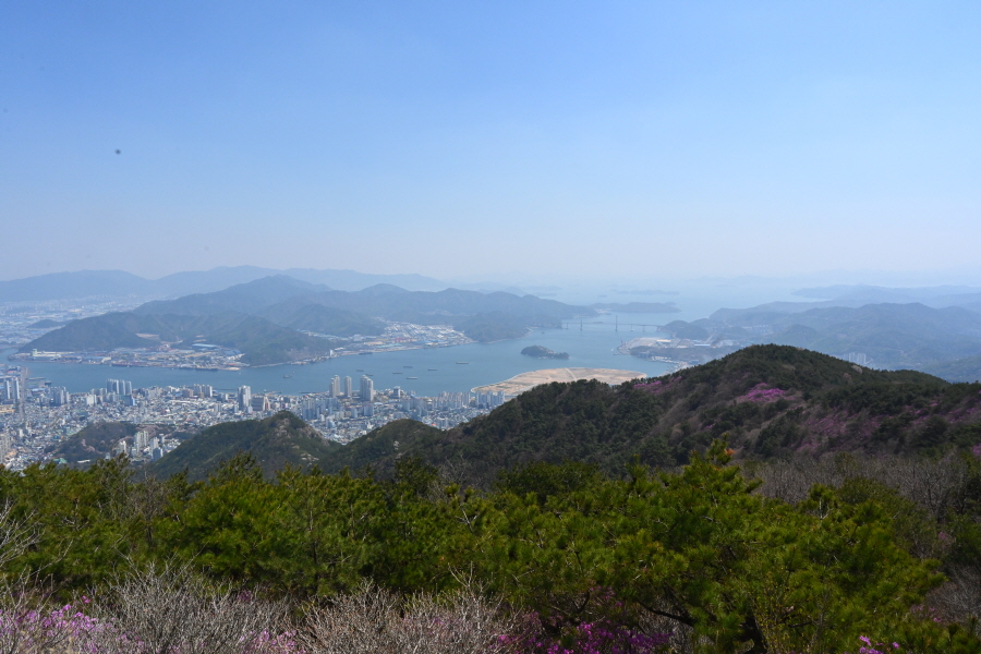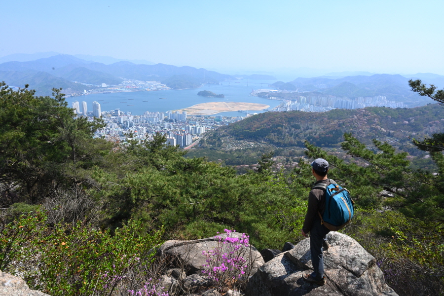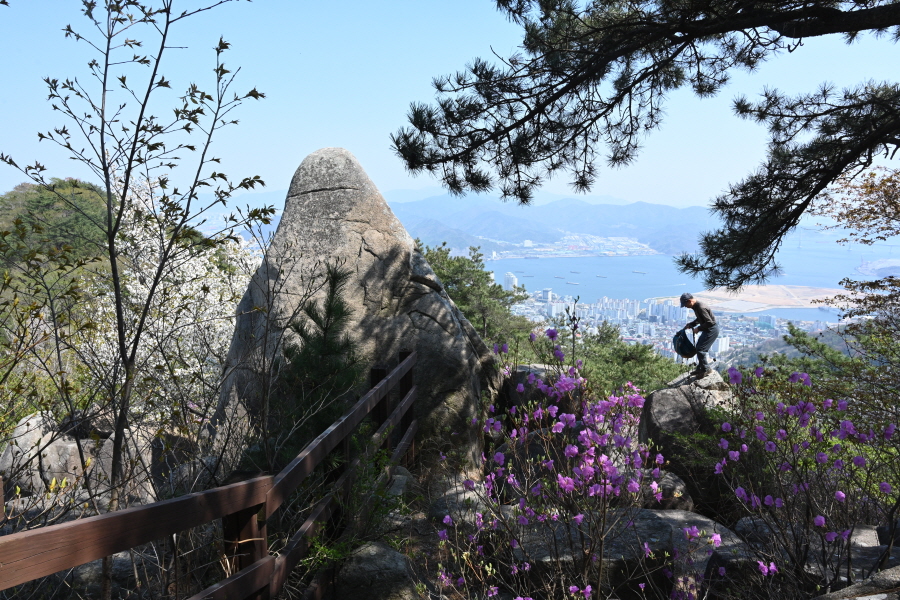 정자가 있는 705봉 까지 가파르게 오르거나 완만한 길이 이어지는 외길 능선입니다. 창원의 산과 마산항의 돝섬 마창대교 합포(마산)만 조망이 시원하게 열리는 잇단 전망대를 지나 꽃몽오리가 맺힌 철쭉 터널을 빠져나갑니다.