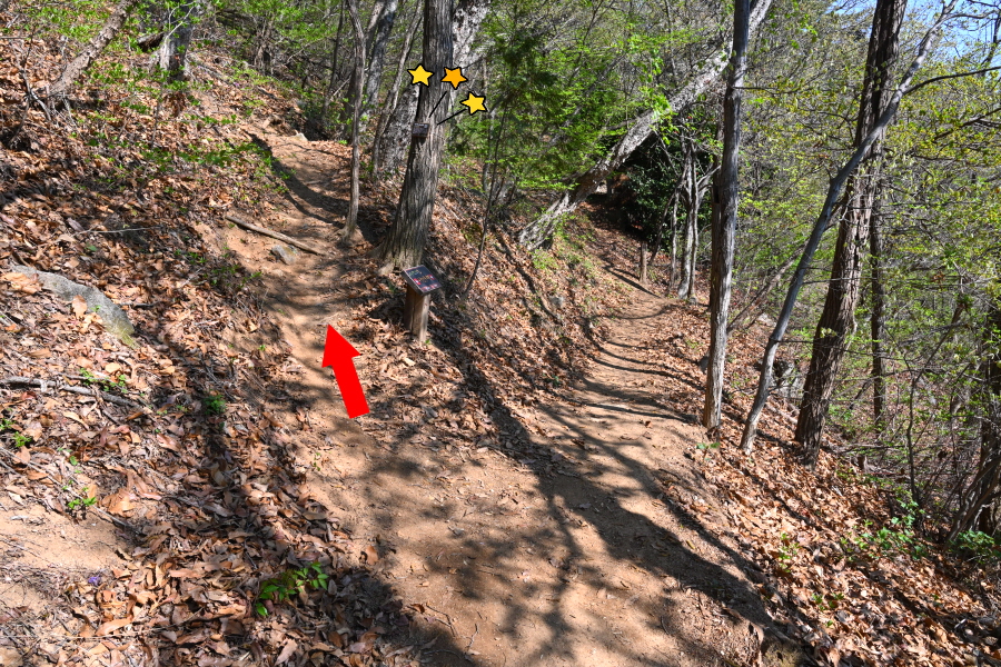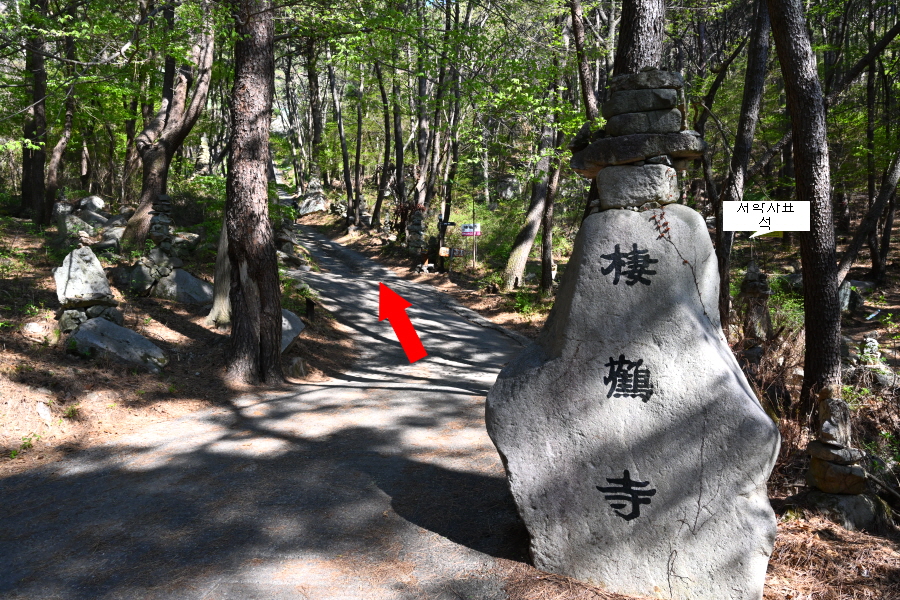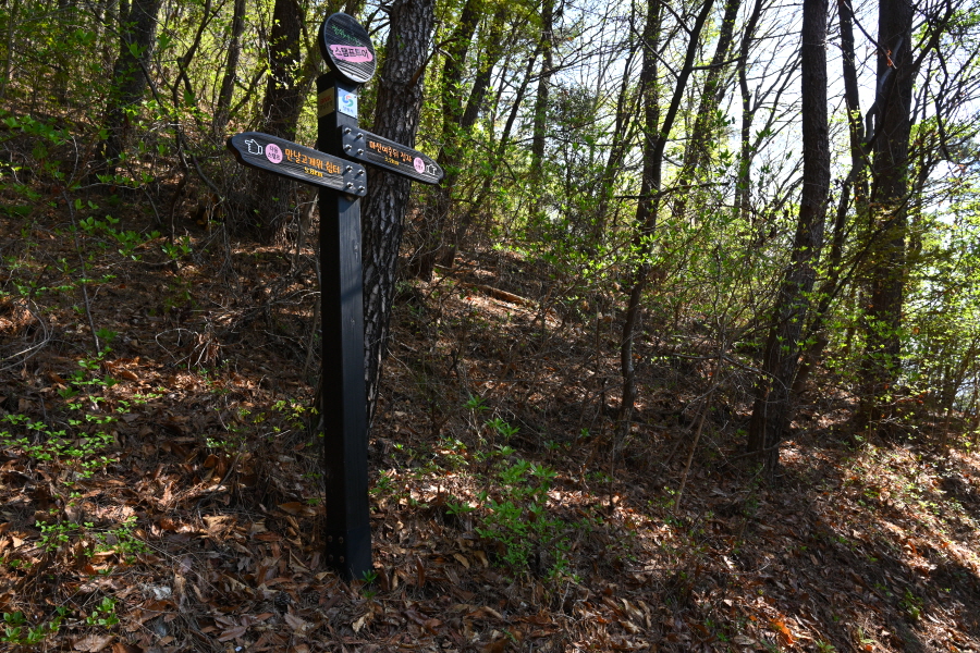 안계 약수터 갈림길을 지나 ‘Y자’ 갈림길에서 왼쪽 학봉(1.3㎞)으로 갑니다. 오른쪽은 만날 고개 방향. 3분이면 능선 갈림길, 학룡사 위 등산로 입구(2.1㎞)로 직진합니다. 오른쪽은 대곡산 정상 방향 낙남정맥 길.