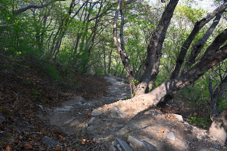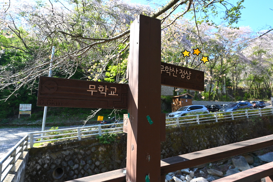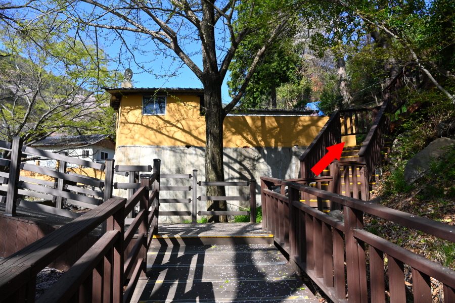 무학산 정상은 개울을 끼고 덱 길을 오릅니다. 팝콘을 터트린 끝물의 벚나무 뒤로 가야할 무학산 정상부가 보입니다. 10분이면 원각사 옆 덱 삼거리에 닿고, 오른쪽으로 덱 계단을 올라가면 콘크리트 갈림길에 도착합니다. 오른쪽 서학사(350m)로 갑니다. 왼쪽은 무학산 정상 방향.