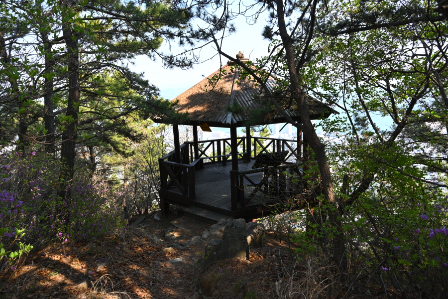 중간 중간 진달래가 무리지어 분홍색 꽃을 폈습니다. 달맞이 고개에서 1시간10분이면 봉우리에 올라서고, 왼쪽 300m 앞에 705봉에 정자가 보입니다.