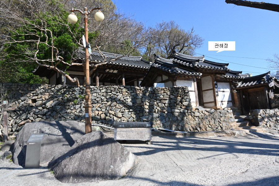 서원곡공영주차장에서 출발합니다. 안쪽 상단 주차장에서 오른쪽 교방천에 놓인 덱 다리를 건너면 수령 480년 된 은행나무와 관해정이 나옵니다. 한강 정구선생을 기리며 제자가 세운 정자입니다. 1634년(인조 12) 정구선생을 배향하는 회원서원을 관해정 옆에 건립하면서 ‘서원곡’의 유래가 됐습니다. 대원군 때 서원 철폐령으로 훼철되고 현재 관해정만 남았습니다.