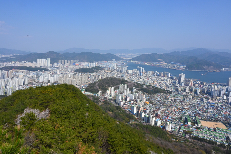 발아래 마산만에 매립중인 마산해양신도시 터와 쪽빛 바다에 뜬 돝섬해상유원지 뒤로 보이는 마창대교에서 시계방향으로 청량산 거제도 미륵산 철마산 벽방산 거류산 광려산 여항산 방어산 월아산 자굴산 청룡산 천주산 구룡산 팔룡산 정병산 장유봉 불모산 장복산 시루봉 천자봉 등이 파노라마로 펼쳐집니다.