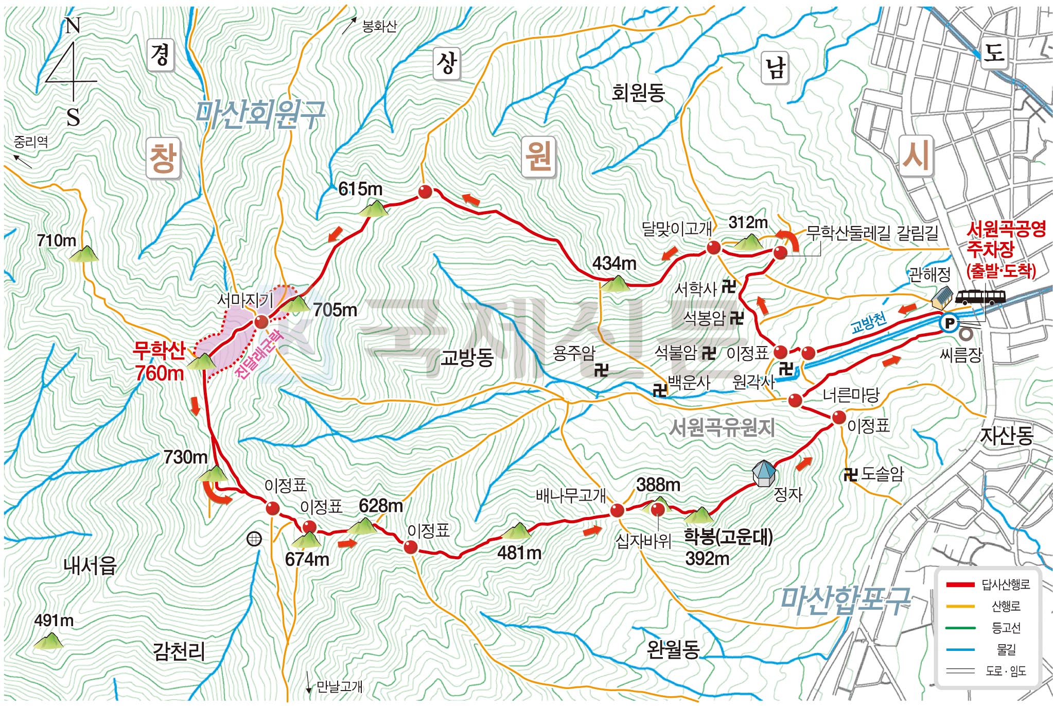 무학산 산행은 서원곡에서 서마지기로 올라 다시 서원곡으로 내려가거나, 학봉(鶴峰·392)을 거쳐 서원곡 입구로 대부분 하산합니다. 또한 만날 고개 봉화산 내서읍으로 능선이 연결돼 장거리 산행도 할 수 있어 산행하기에 정말 좋아 그래서 창원의 진산이라 하는가 봅니다.