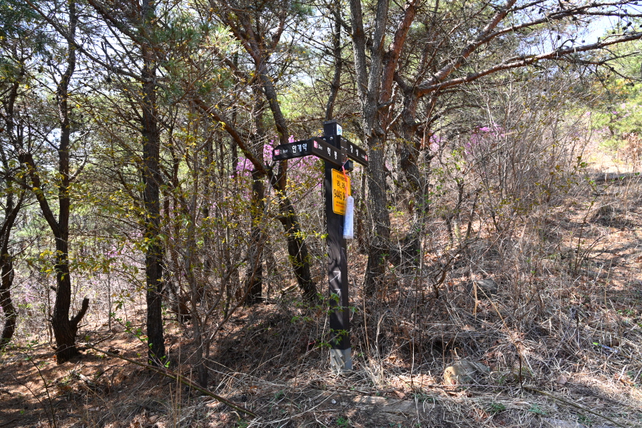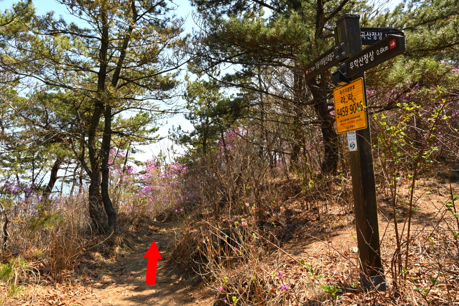 진달래 꽃구경을 하며 10분이면 왼쪽 만날 고개(3.6㎞)로 헬기장을 지나 무학산 고샅에 섭니다. 오른쪽은 대서 중리역과 마재 고개 방향.