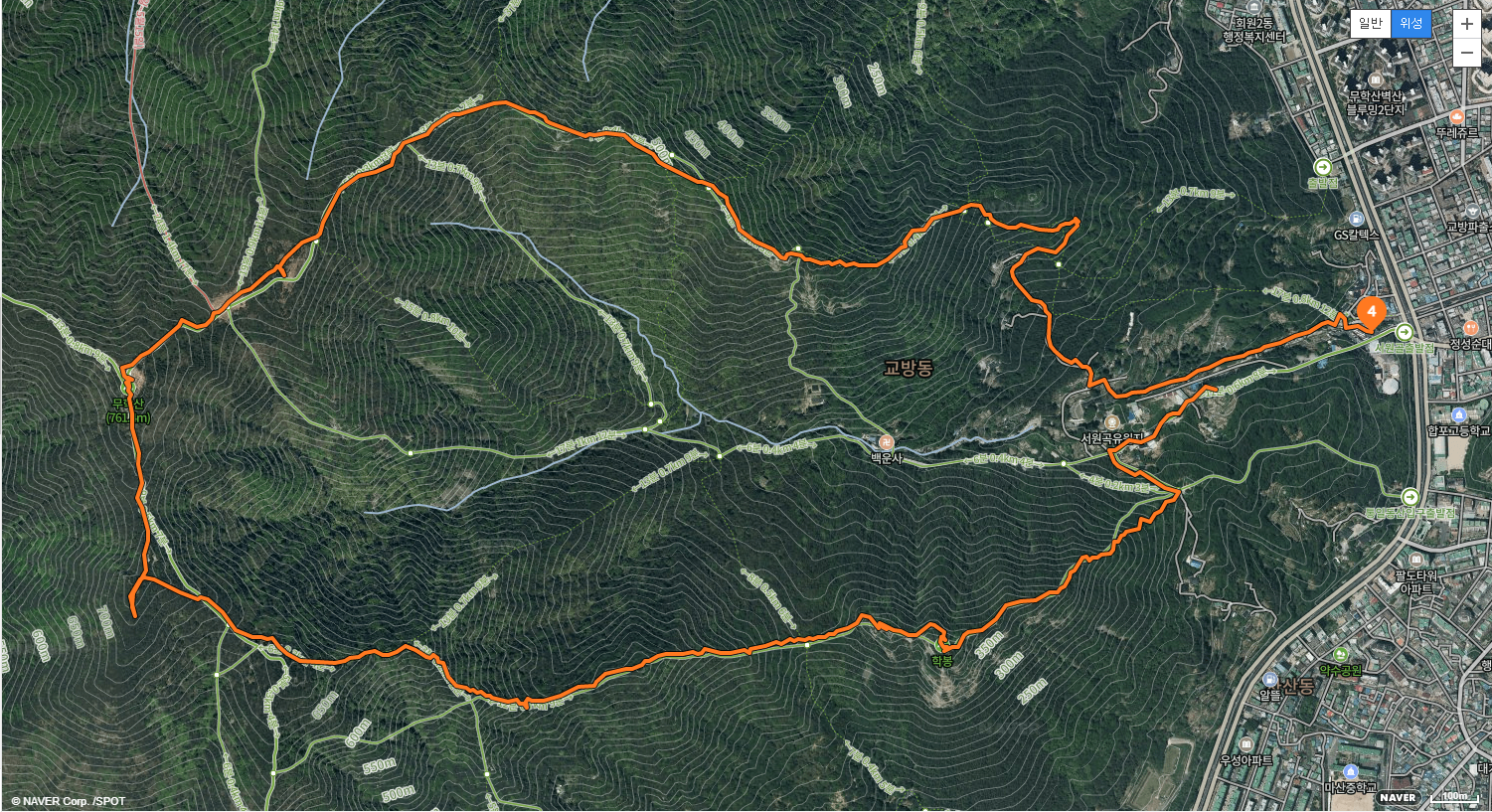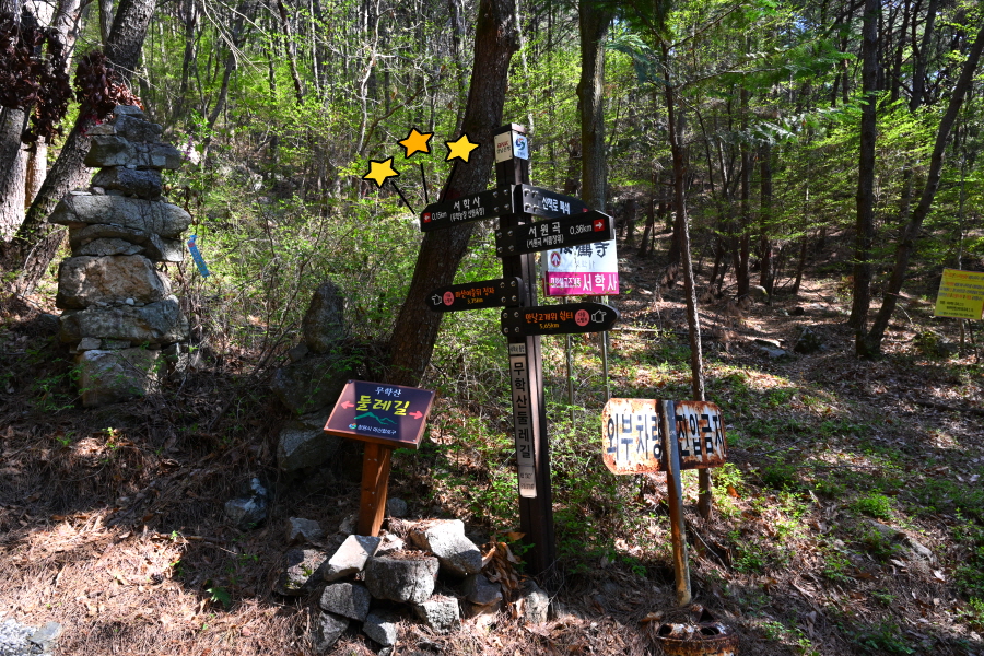 필자는 진달래 산행으로 짧게 타려고 서원곡 기존 등산로 대신 관해정 능선으로 오르는 코스인데, 공영주차장에서 서원곡 오른쪽 관해정 능선을 타고 정상에 오른 뒤 학봉으로 하산했습니다.