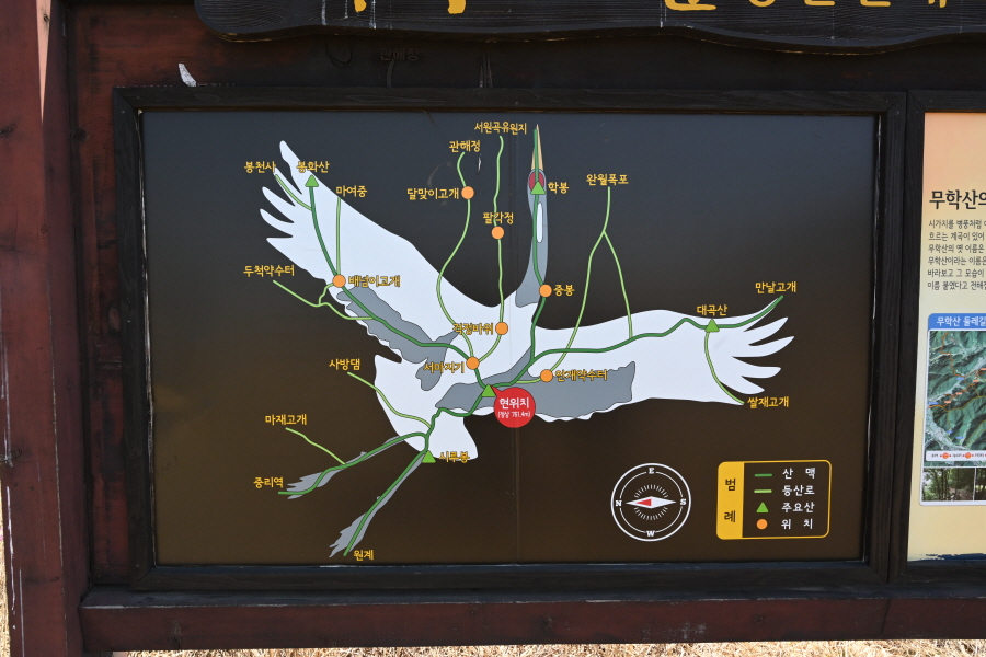 산행경로를 보면 마산합포구 서원곡공영주차장~관해정(은행나무)~덱 길~원각사 옆 삼거리~무학산 정상·서학사 갈림길~서학사 입구~달맞이고개~잇단 전망대~705봉~서마지기~무학산 정상~덱 갈림길~안계 약수터·학봉 갈림길~‘Y자’ 갈림길(학봉 이정표)~학룡사 위 등산로 입구·대곡산 정상 갈림길~학봉·학룡사 위 등산로 입구 갈림길~선바위~배나무고개~십자바위~학봉~너른 마당(체육공원)~서원곡~원각사 입구~서원곡 공영주차장에 되돌아오는 원점회귀다. 산행거리는 약 7㎞이며, 4시간 안팎이 걸립니다.
