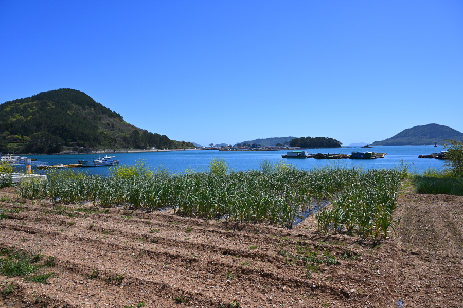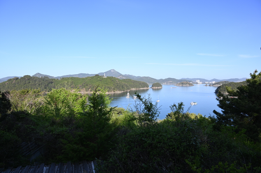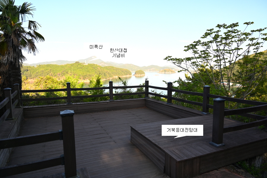 미륵산 앞으로는 학익진을 펼치며 한산대첩을 승리로 이끈 한산만의 전경도 관찰됩니다.