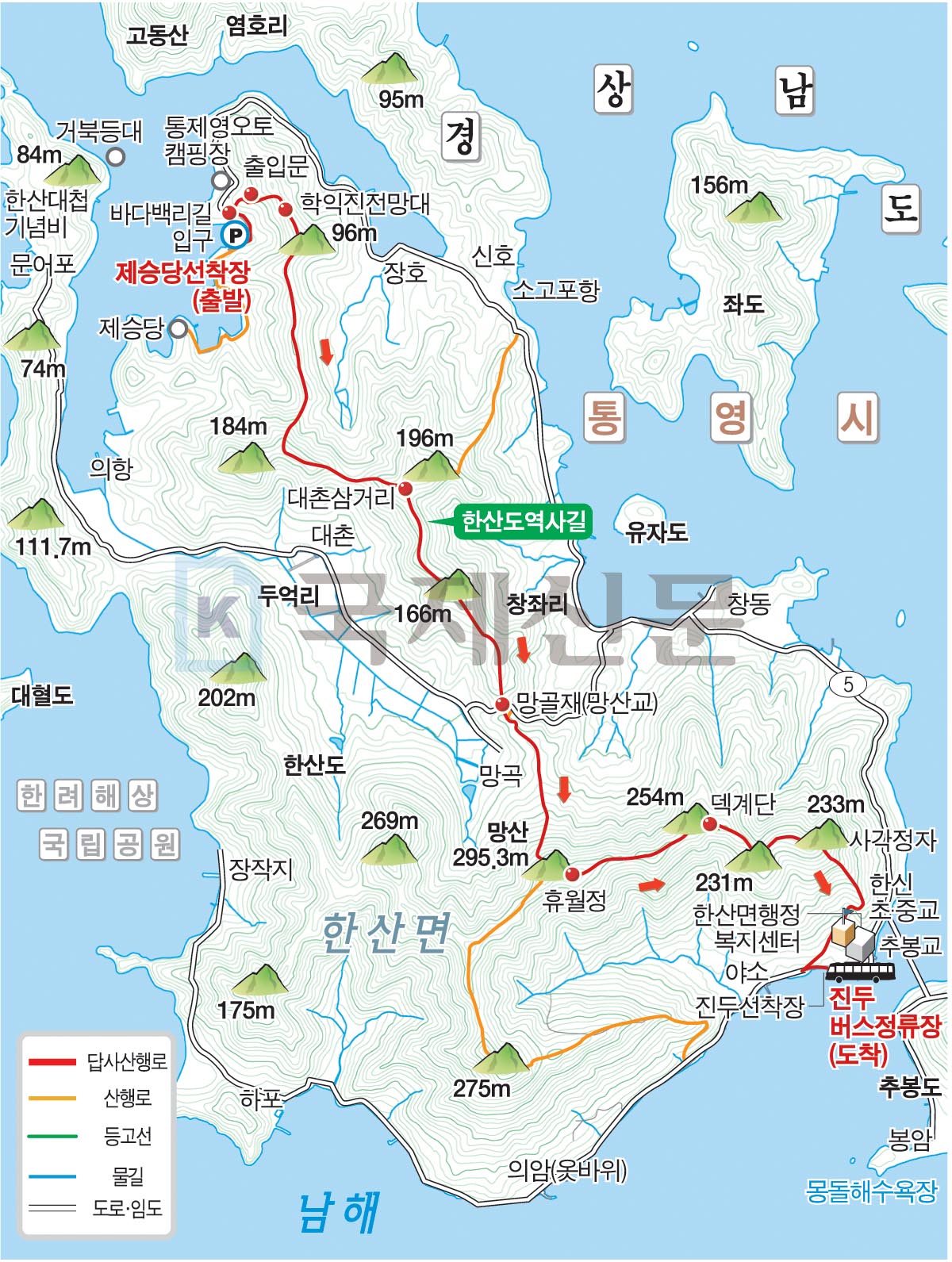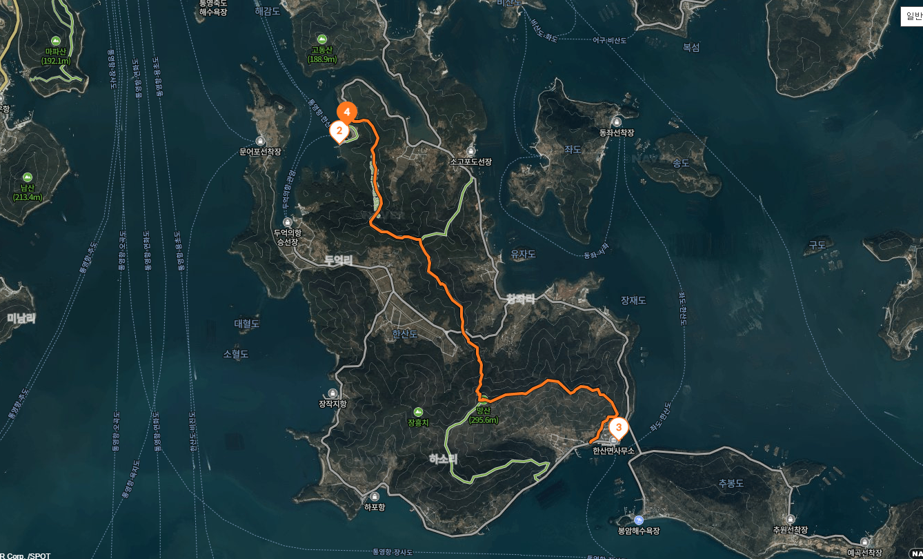 산행경로를 보면 제승당 선착장~바다 백리길(한산도 역사길) 입구~한산도 역사길 출입문~대촌 삼거리~망골재(망산교)~망산 정상~팔각정~사각정자 쉼터~망산 입구 차단기를 내려 선 뒤 도로에서 왼쪽으로 꺾어 진두마을정류장에 도착합니다. 산행거리는 약 7.5㎞이며 3시간30분 안팎이 걸립니다.