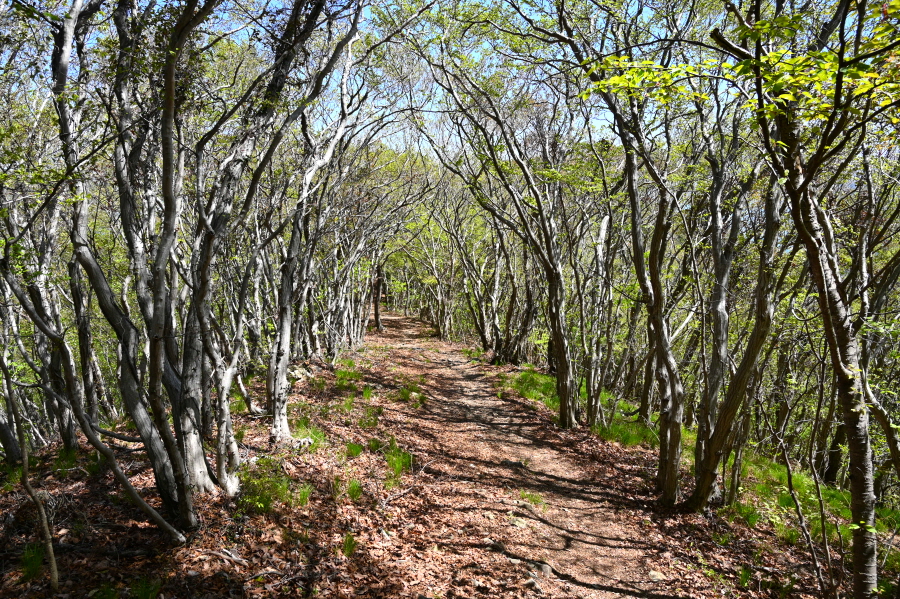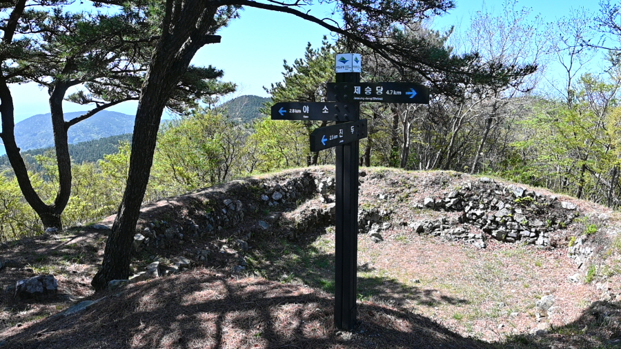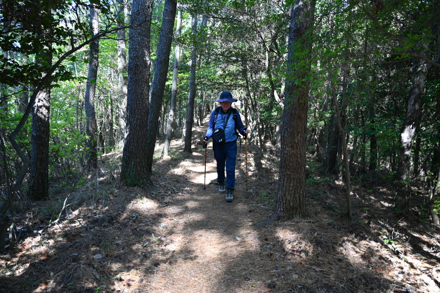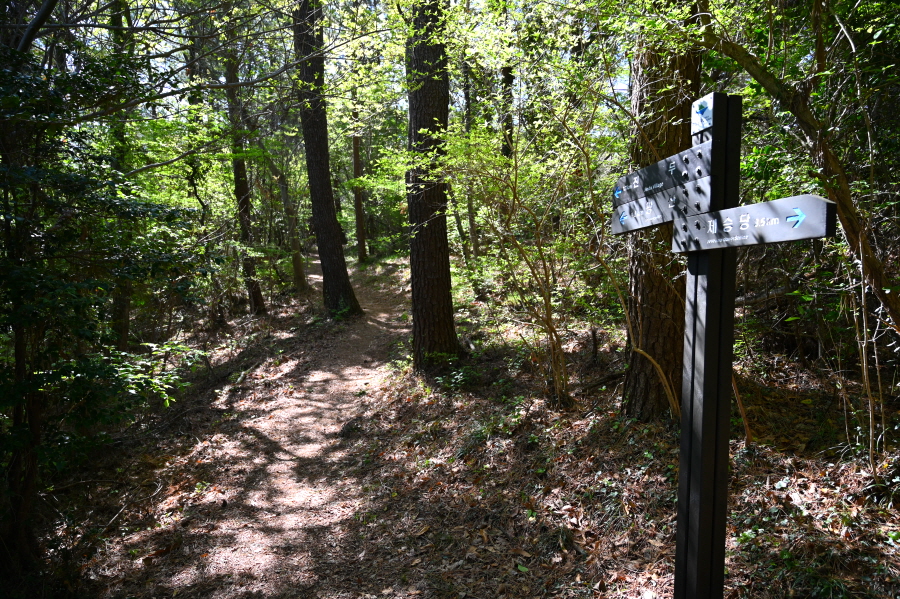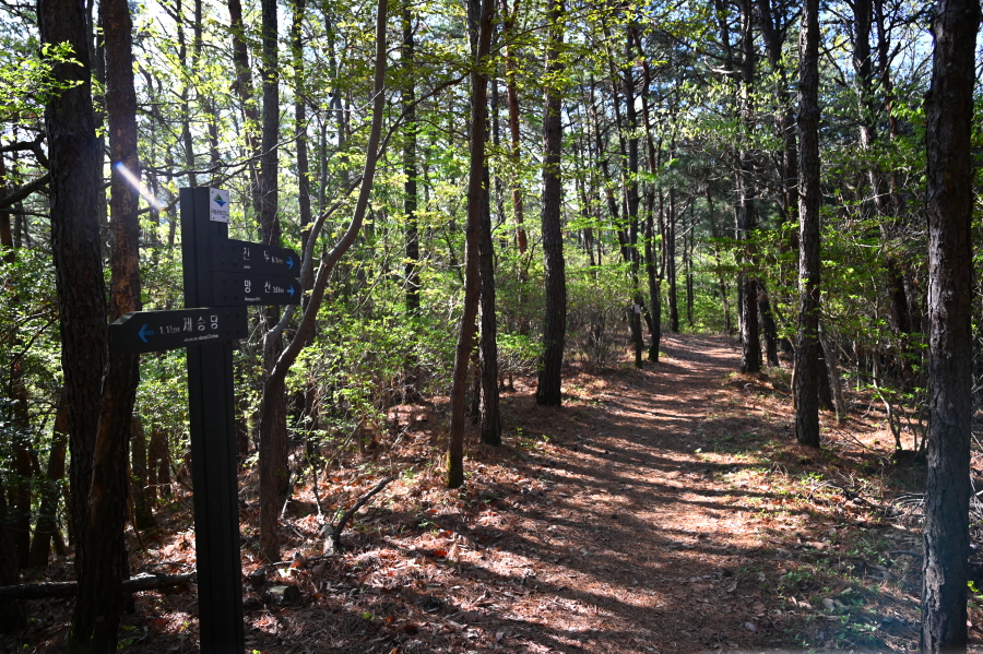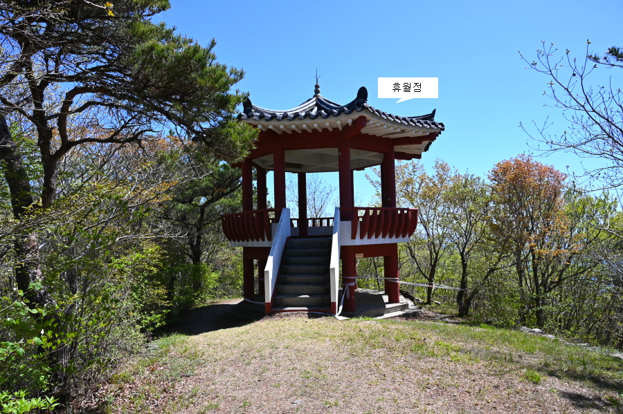 하산은 정상석 앞을 지나 진두(2.5㎞) 마을로(2.5㎞) 내려갑니다. 오른쪽은 야소 방향. 연둣빛 새잎이 돋아난 소사나무 숲길입니다. 곧 달이 쉬어 간다는 ‘휴월정’을 지납니다.