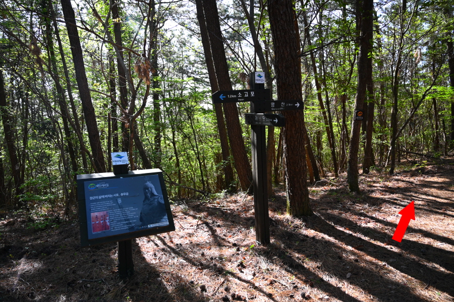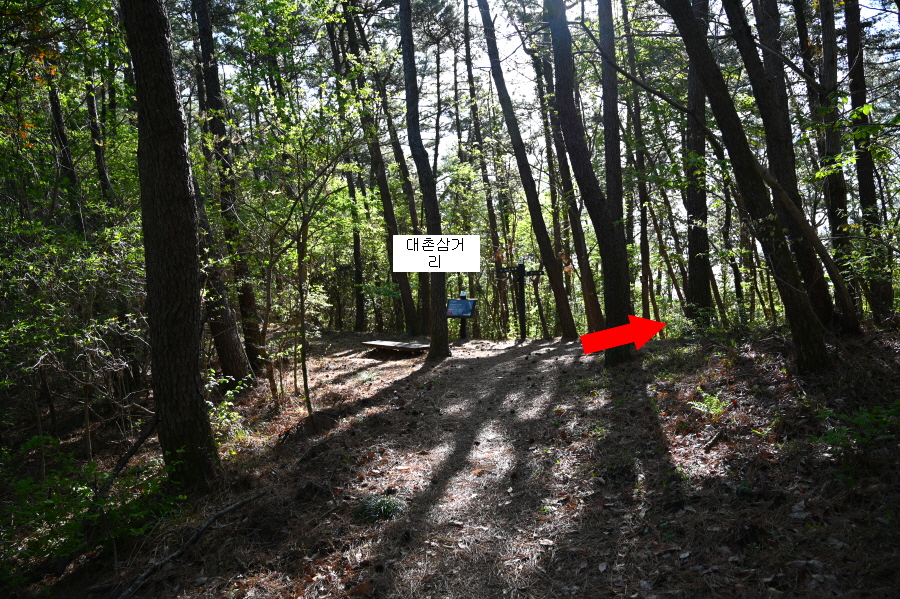 바다 백리길 들머리에서 약 50분이면 대촌삼거리에 도착합니다. 망산(2.4㎞)은 오른쪽으로 꺾습니다. 왼쪽은 소고포에서 올라오는 길.