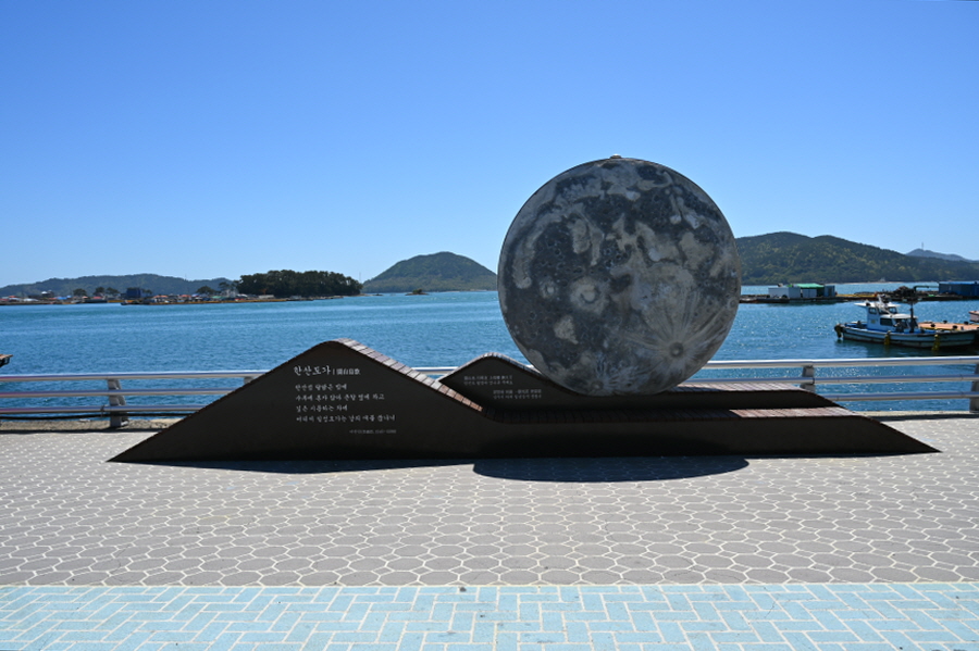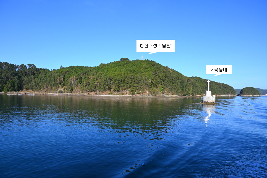 발아래는 왜구의 시체가 바다를 뒤덮었다는 ‘덮을개(더풀개)’이며, 그날의 참상을 기억하는지 고요하다 못해 적막했습니다. 물 위에 떠 있는 거북등대 뒤로 한산대첩기념비와 미륵산이 우뚝합니다.